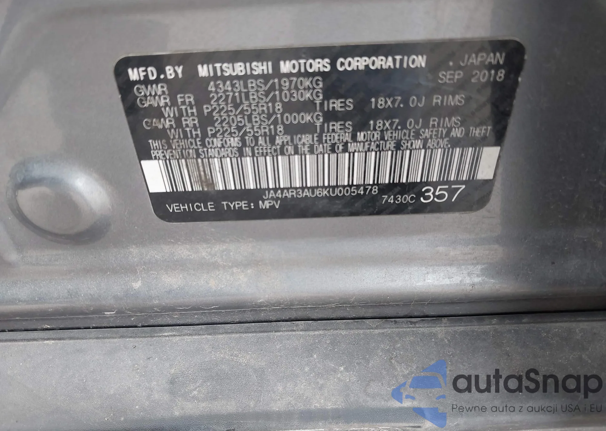 LOT: 44196248 VIN: JA4AR3AU6KU005478