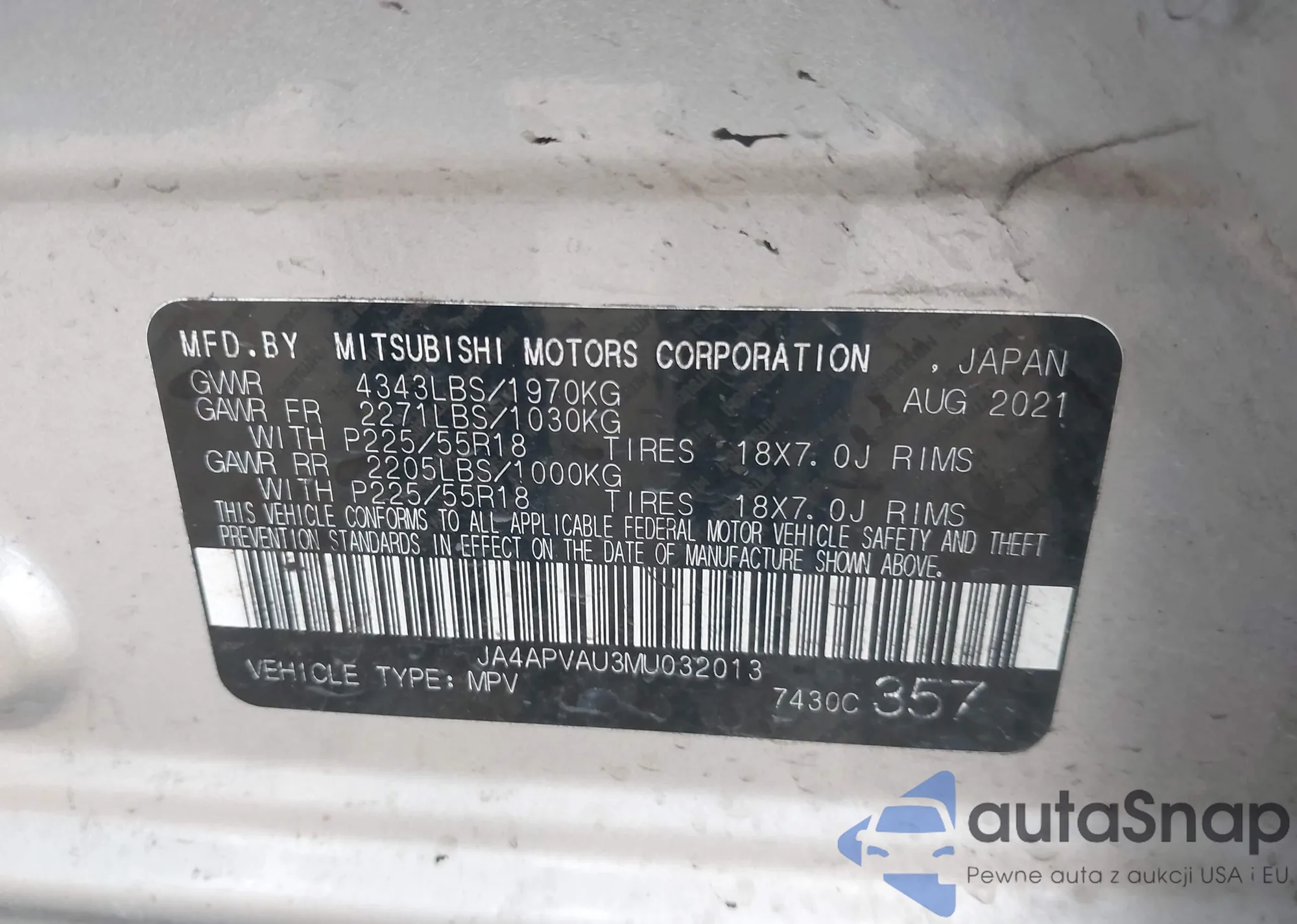 • VIN JA4APVAU3MU032013