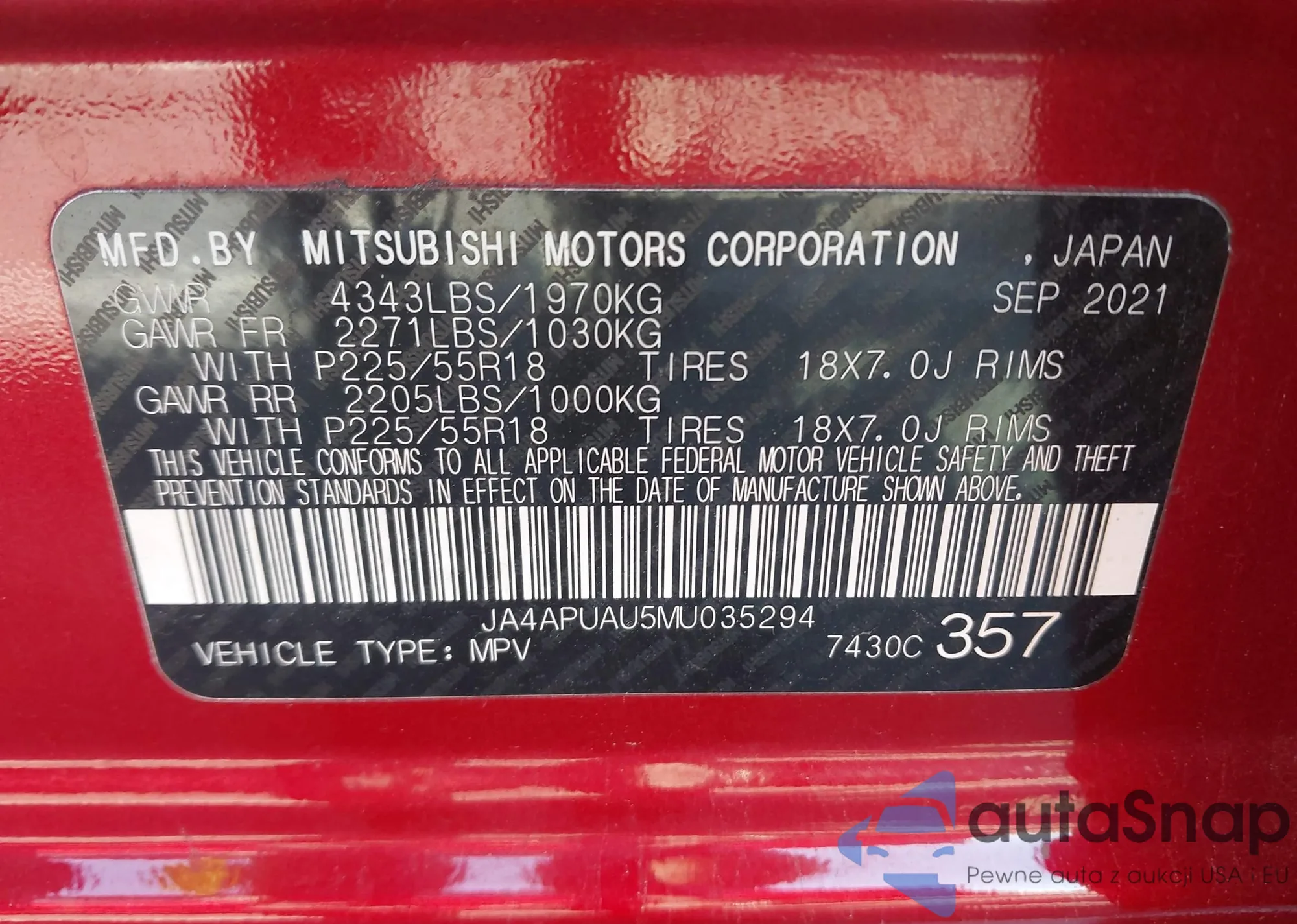 LOT: 43533765 VIN: JA4APUAU5MU035294