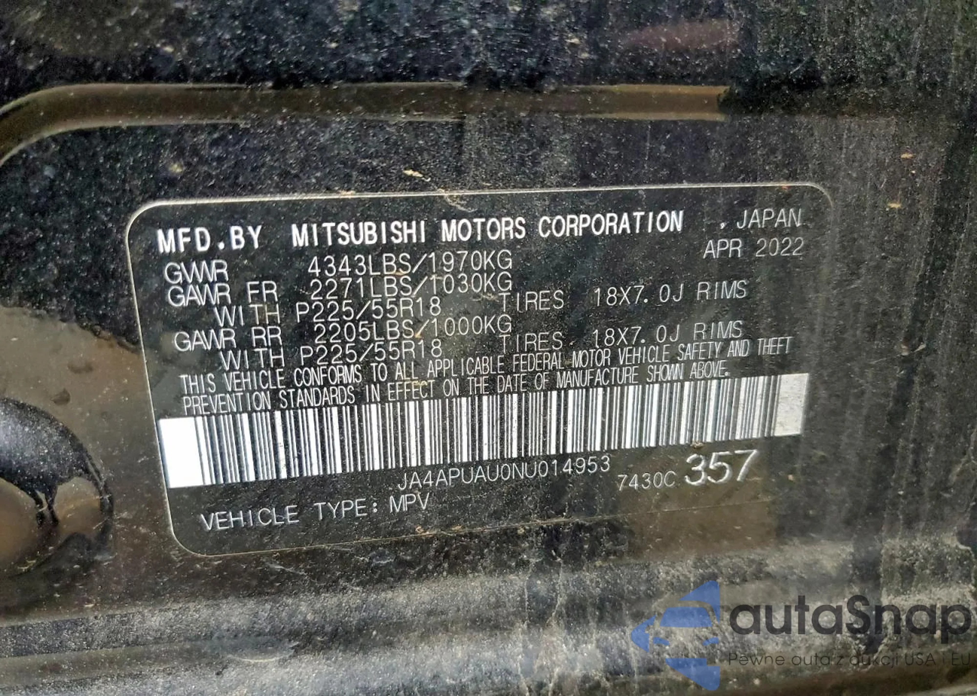 • VIN JA4APUAU0NU014953
