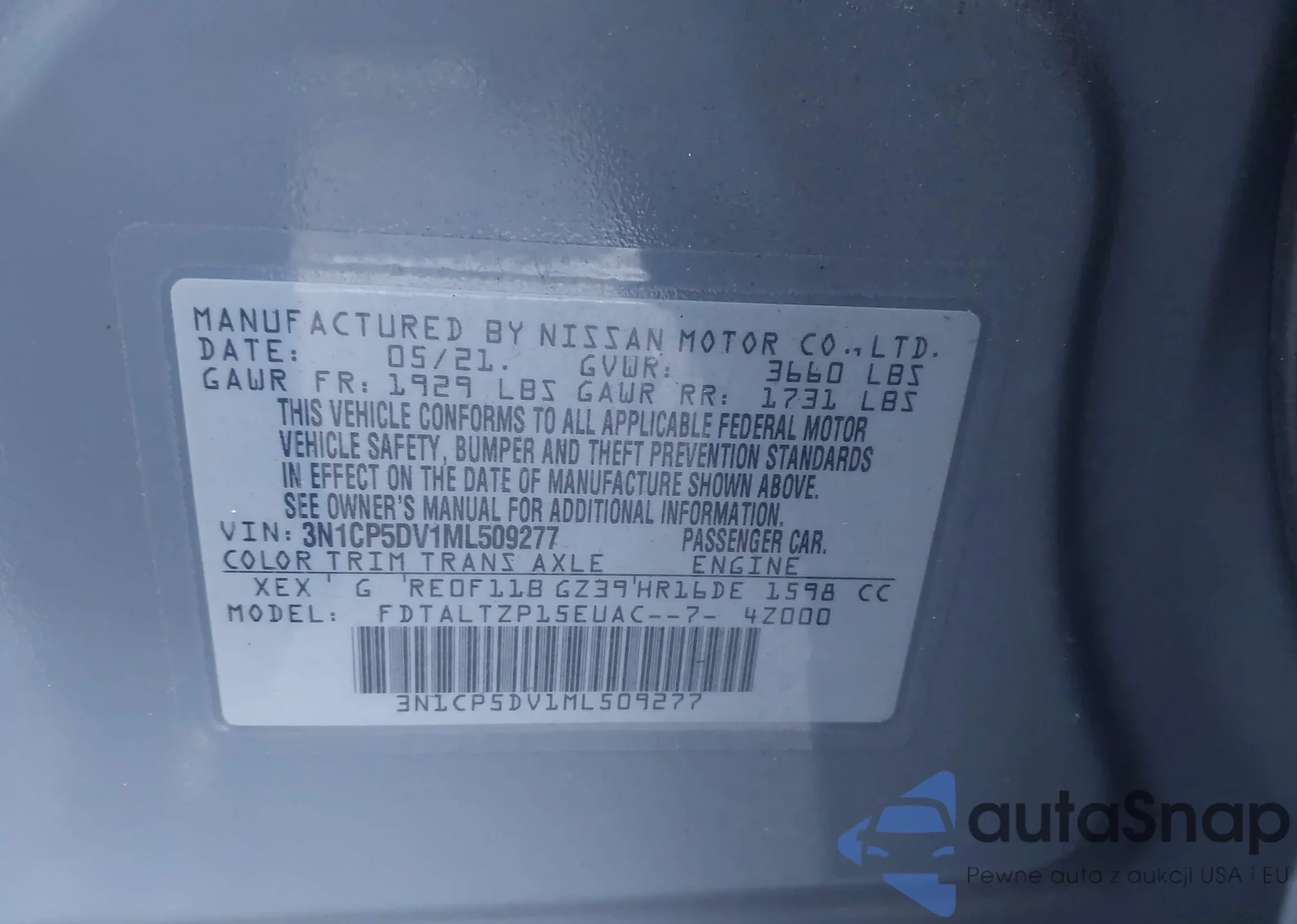 • VIN 3N1CP5DV1ML509277