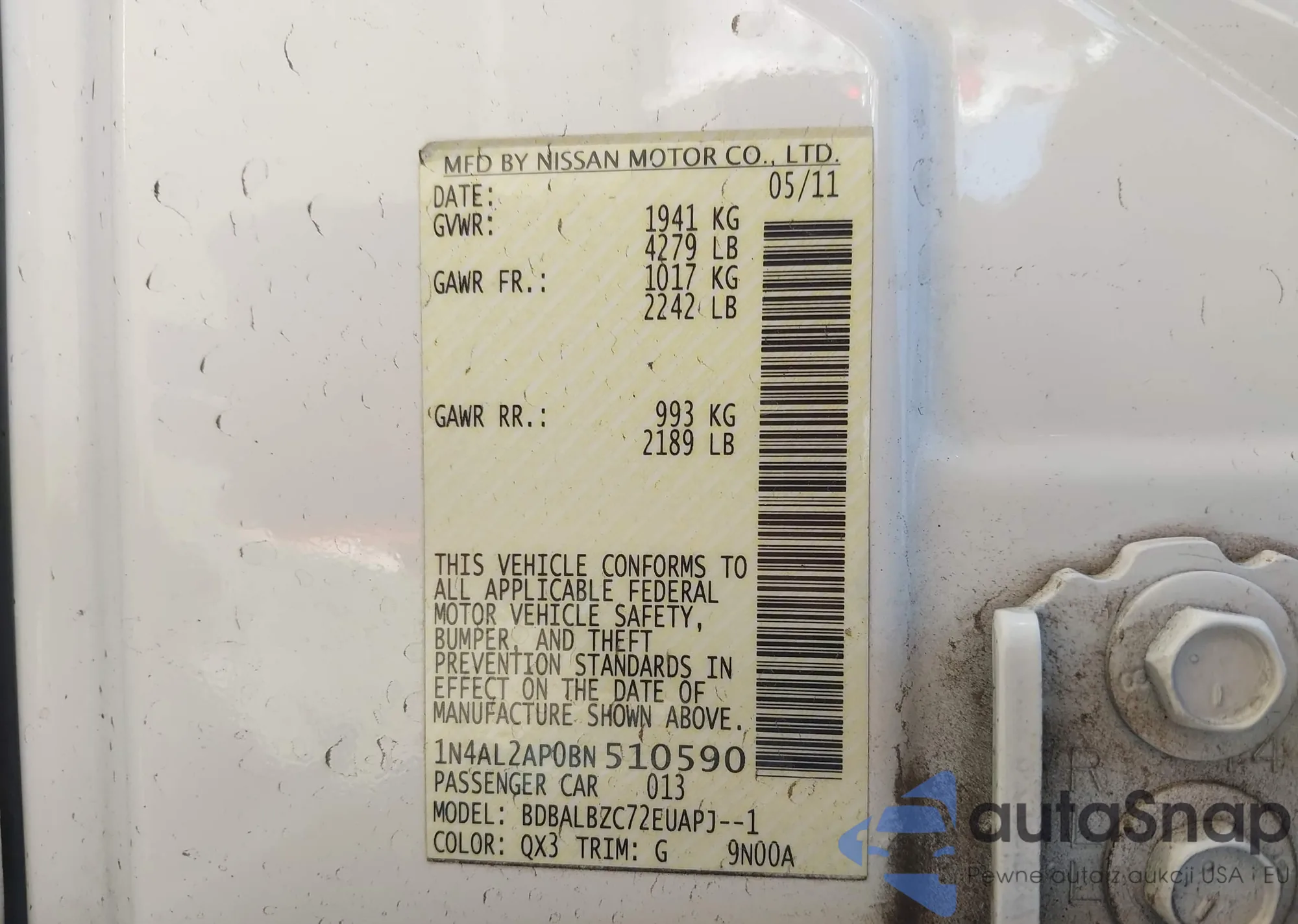 LOT: 43848399 VIN: 1N4AL2AP0BN510590