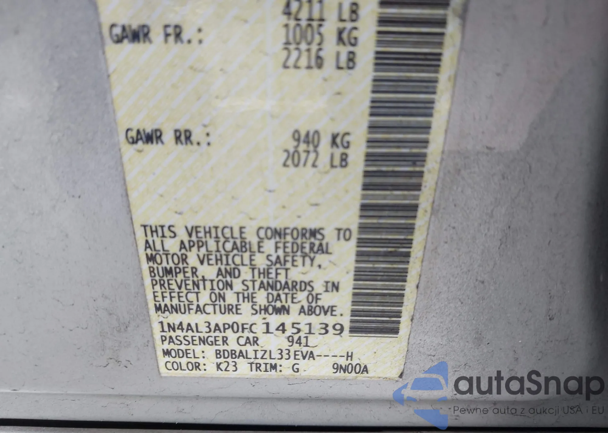LOT: 44067916 VIN: 1N4AL3AP0FC145139