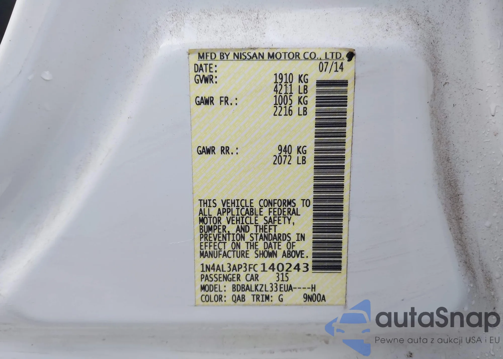 • VIN 1N4AL3AP3FC140243