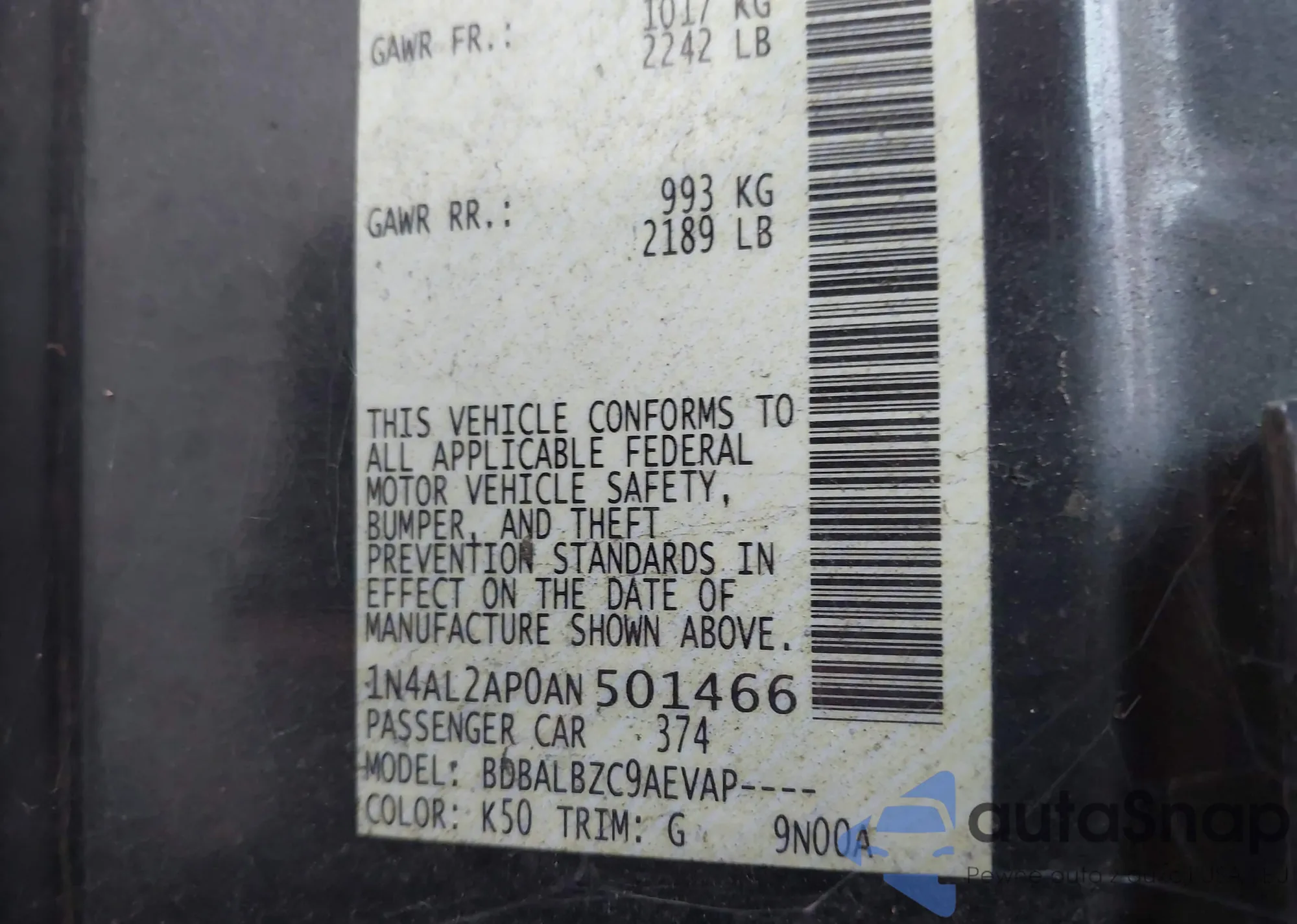 • VIN 1N4AL2AP0AN501466