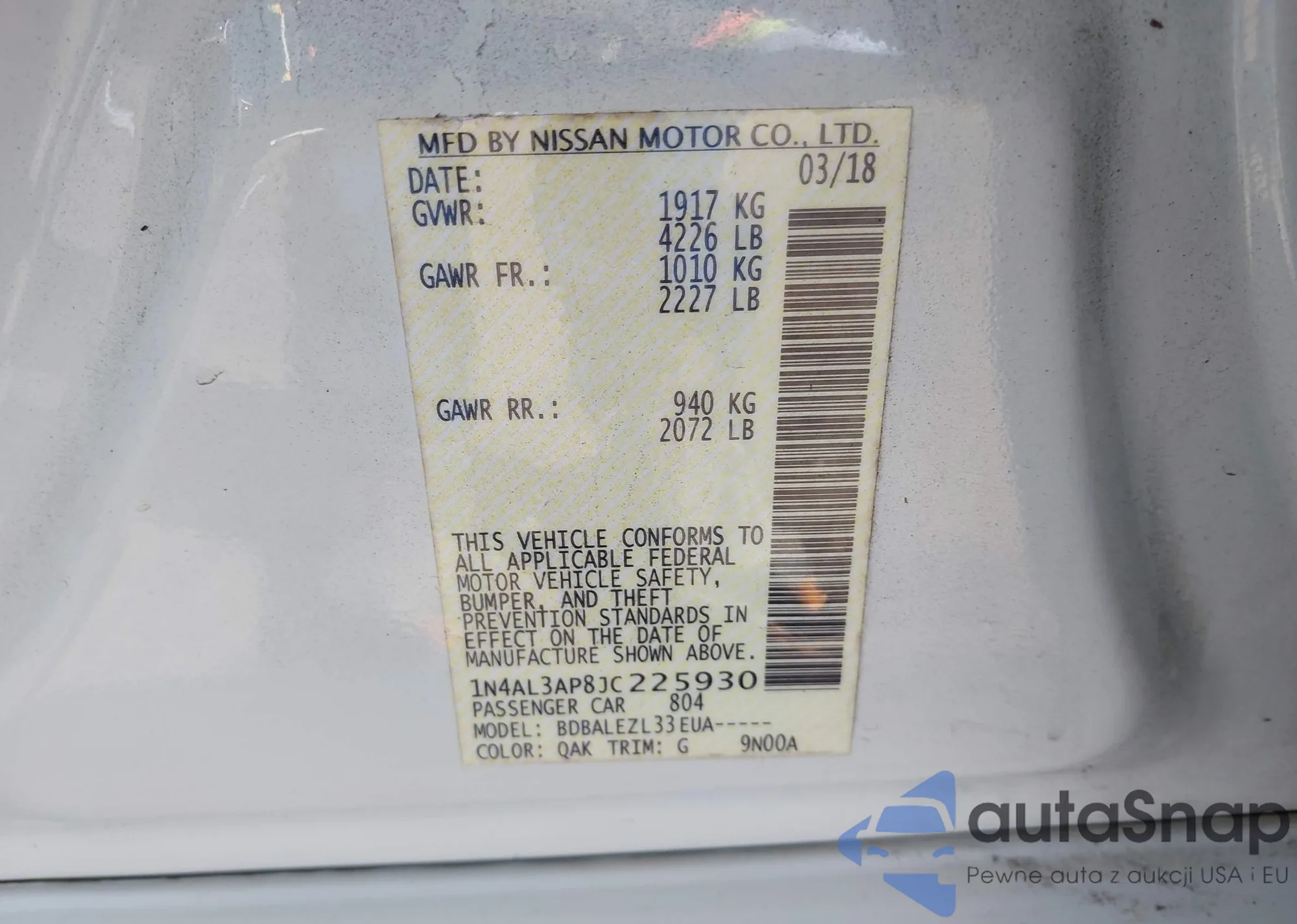 LOT: 43548286 VIN: 1N4AL3AP8JC225930