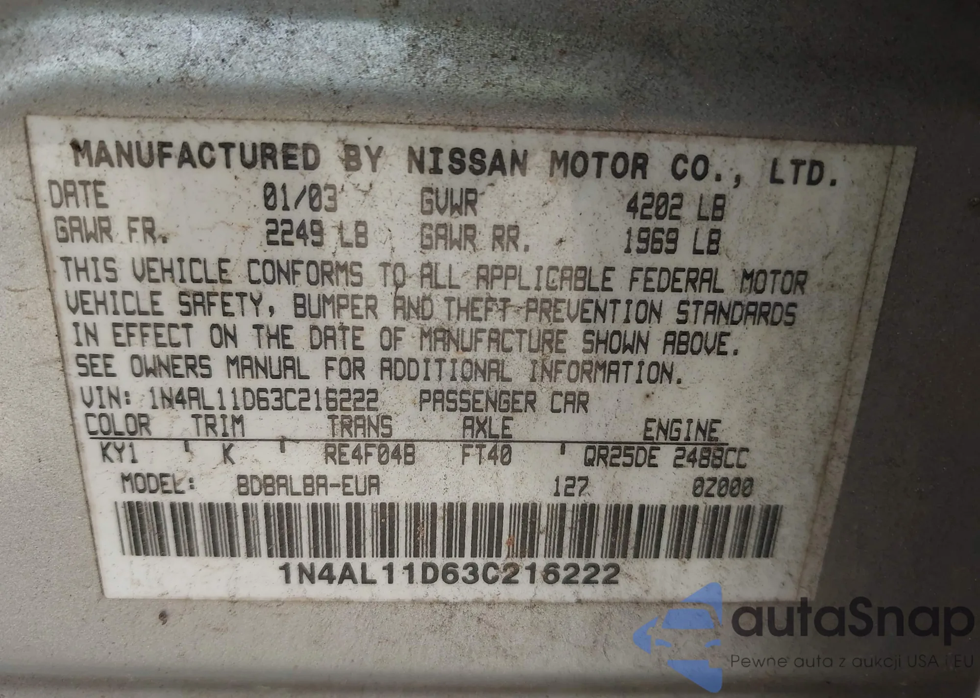 2003 Nissan Altima 2.5 S z USA, uszkodzony, nr VIN 1N4AL11D63C216222