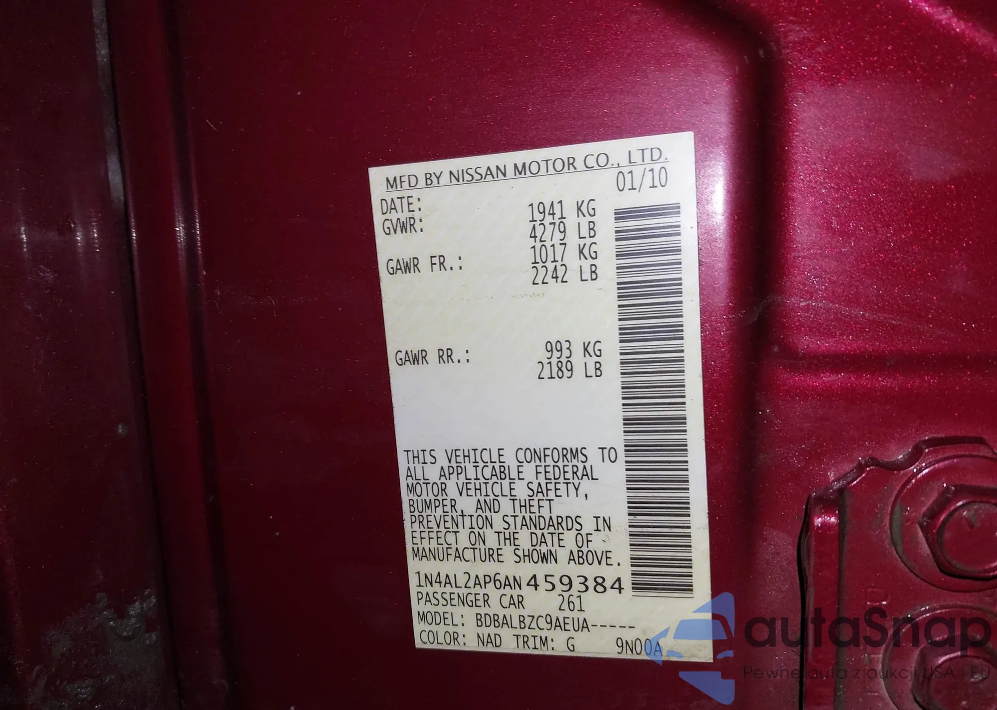 LOT: 43533438 VIN: 1N4AL2AP4AN412838