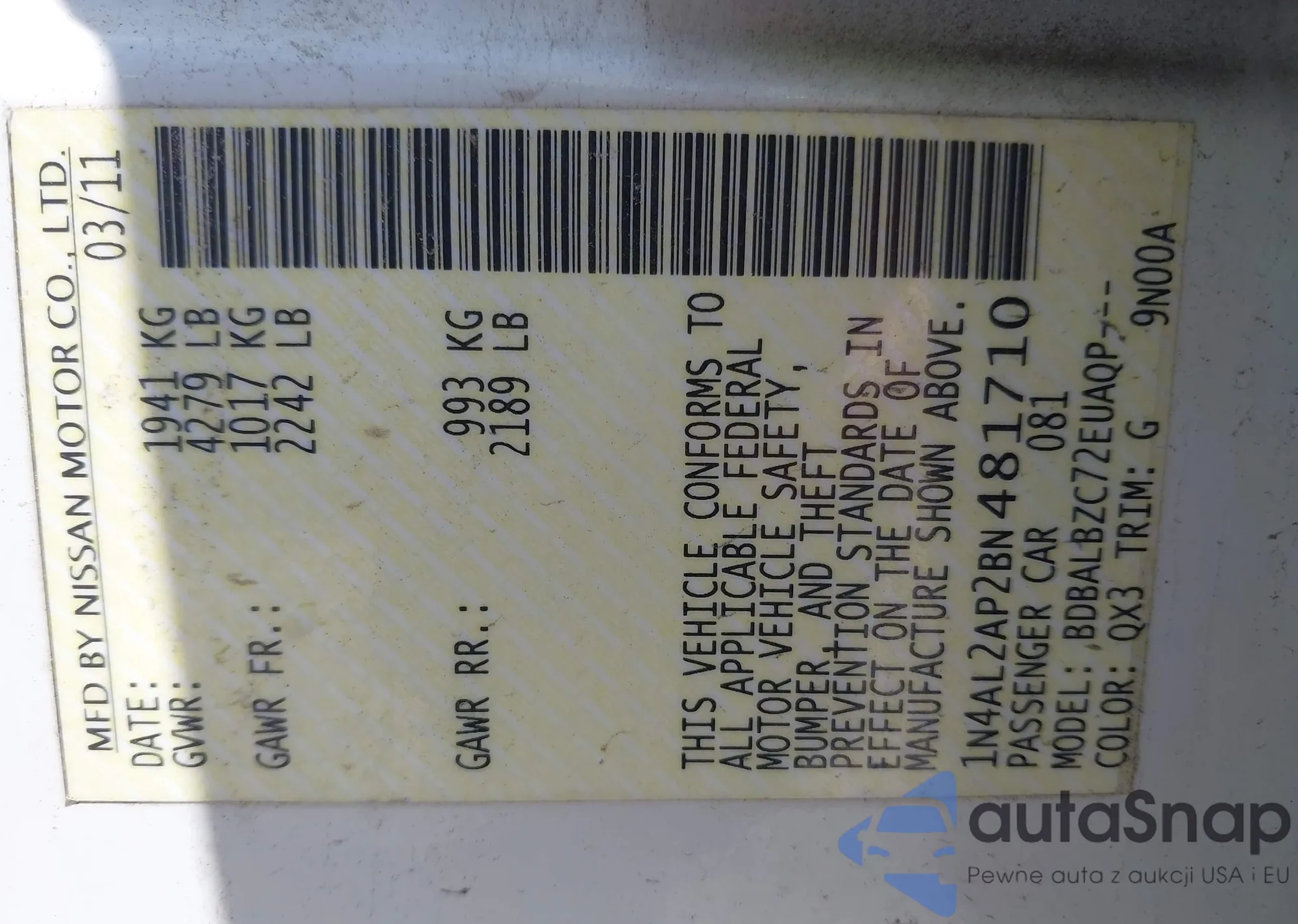 LOT: 44695520 VIN: 1N4AL2AP2BN481710