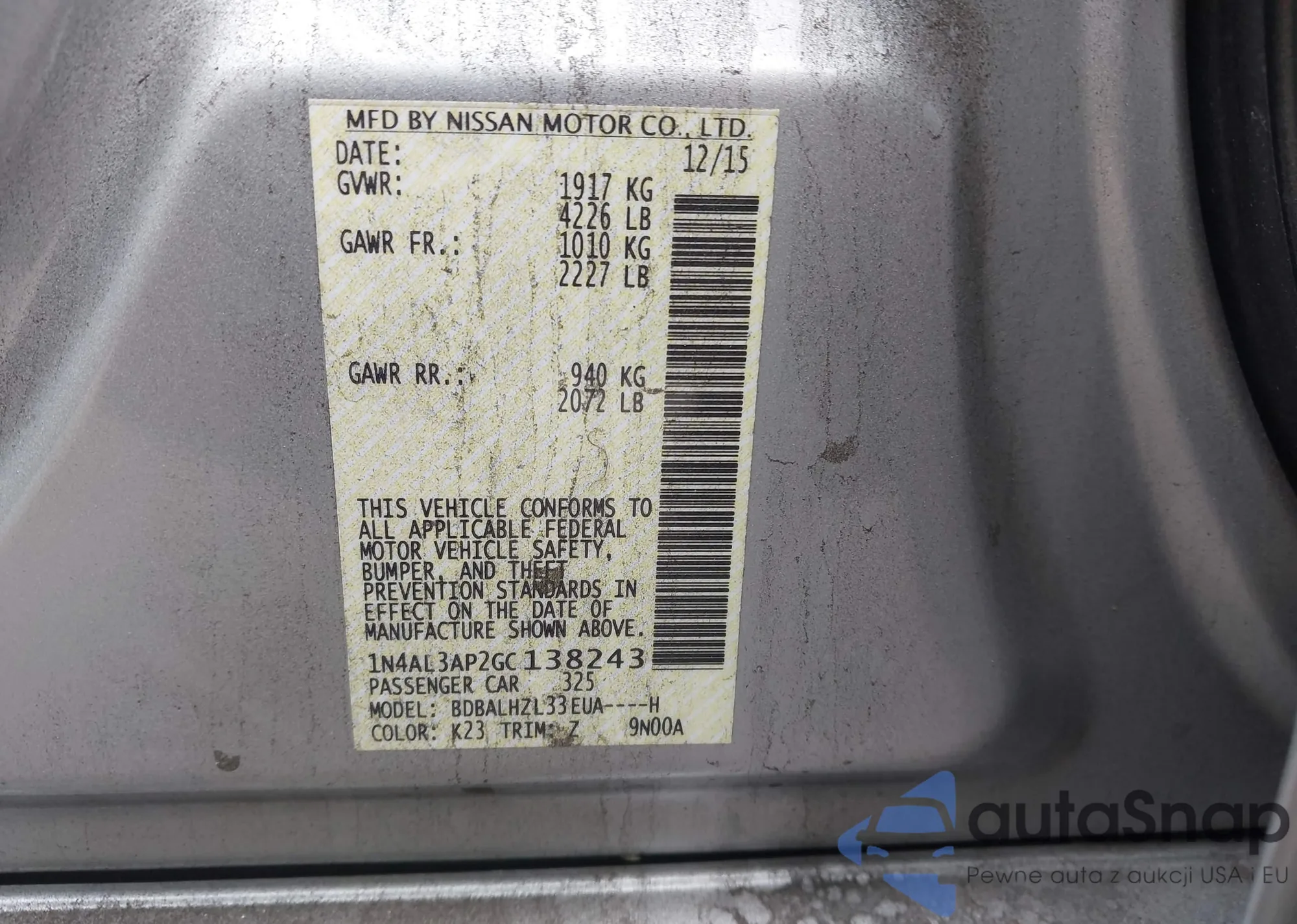LOT: 44333221 VIN: 1N4BL3AP2FC235610
