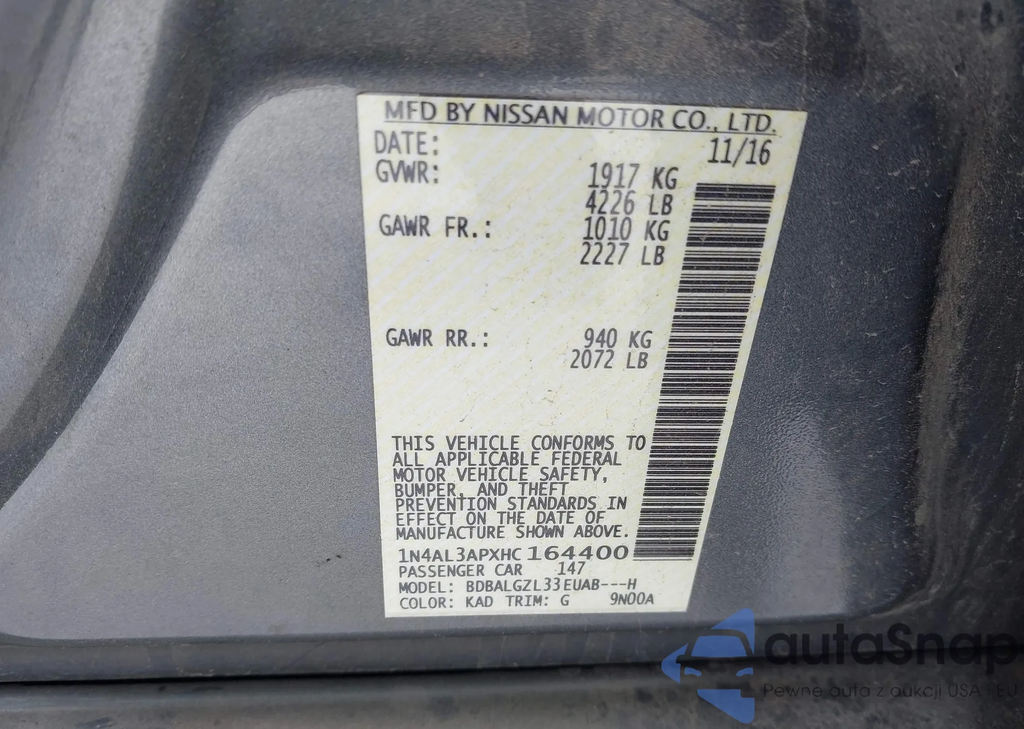 LOT: 43876810 VIN: 1N4AL3APXHC164400