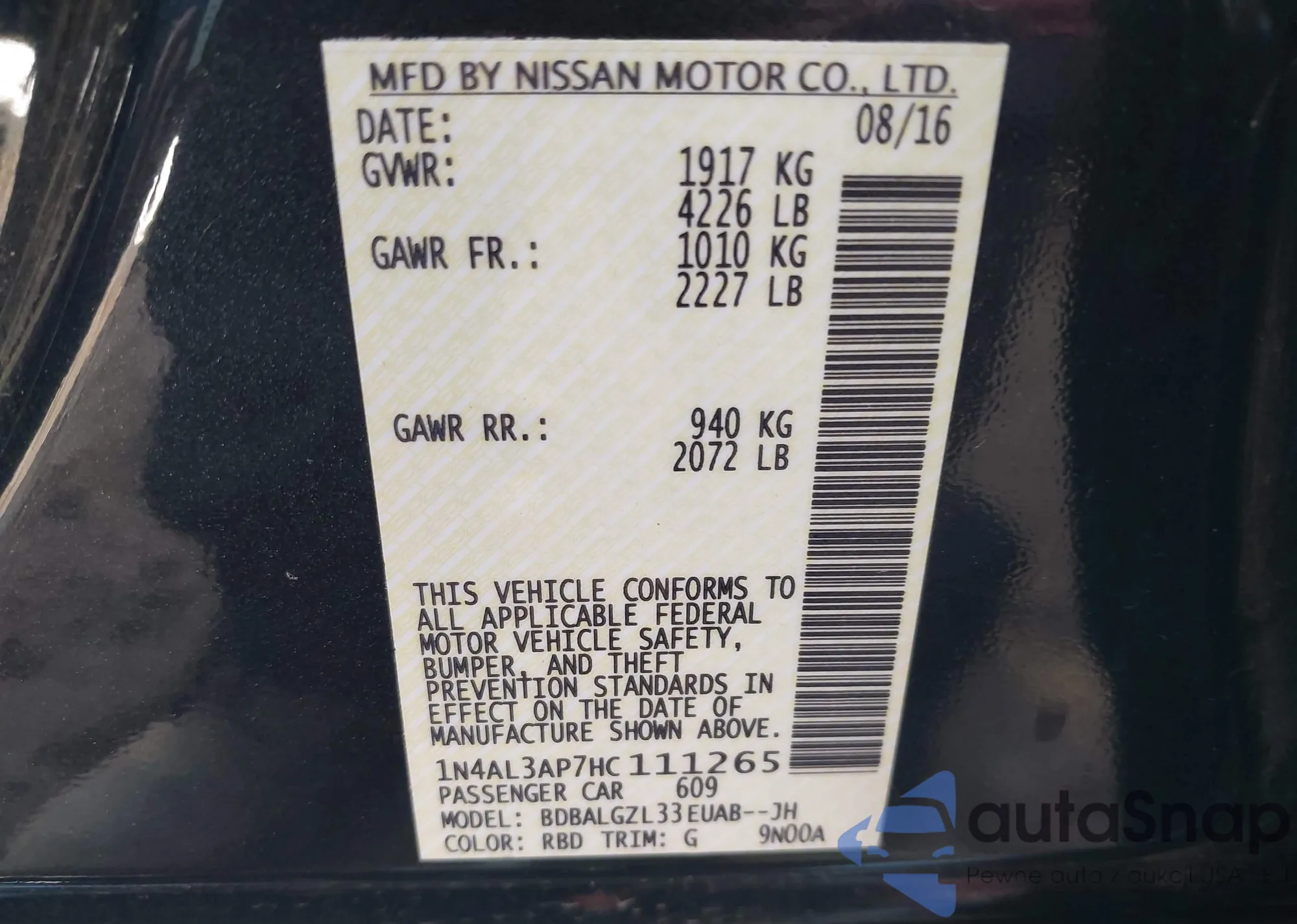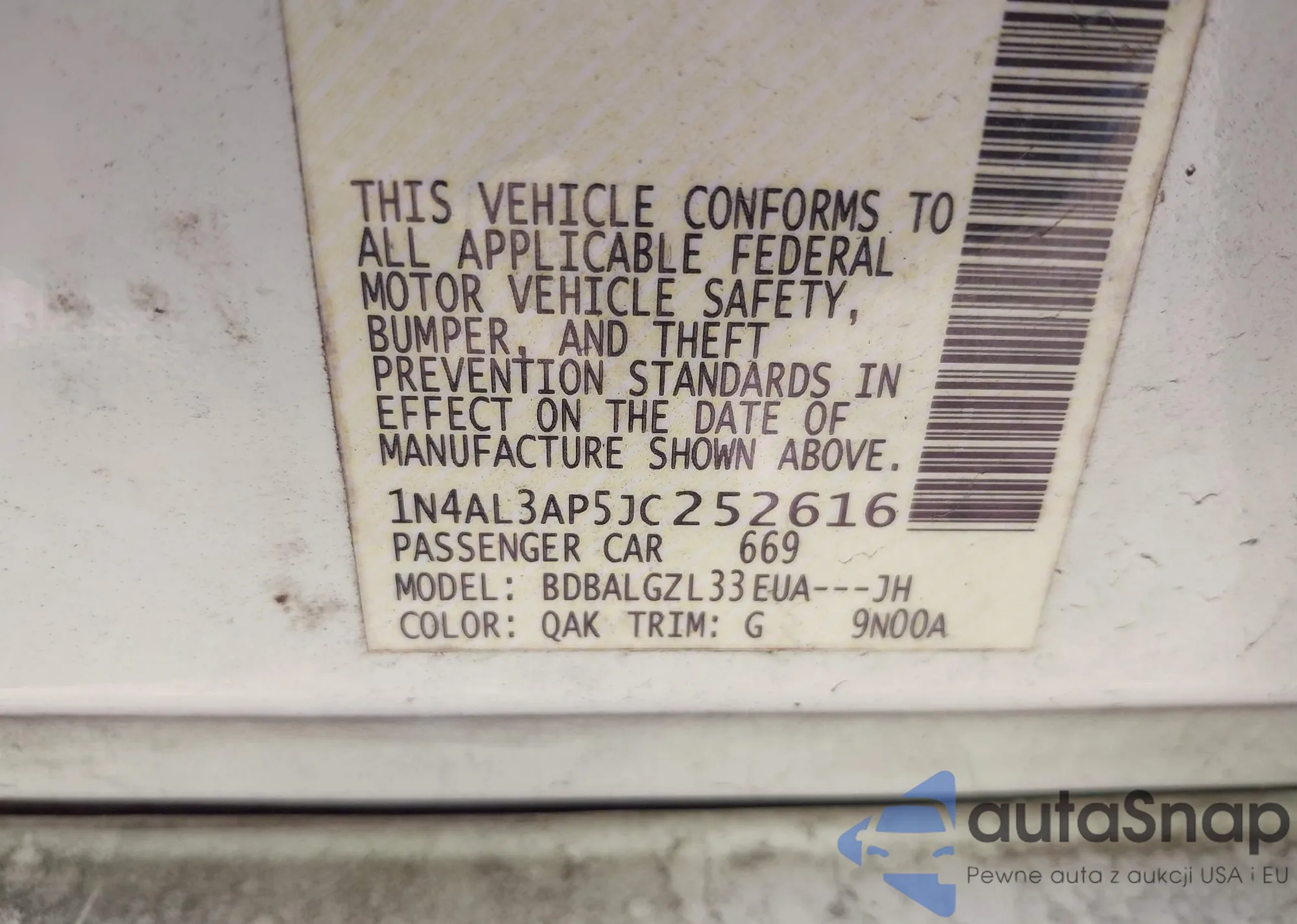 LOT: 44166248 VIN: 1N4AL3AP9JC166371