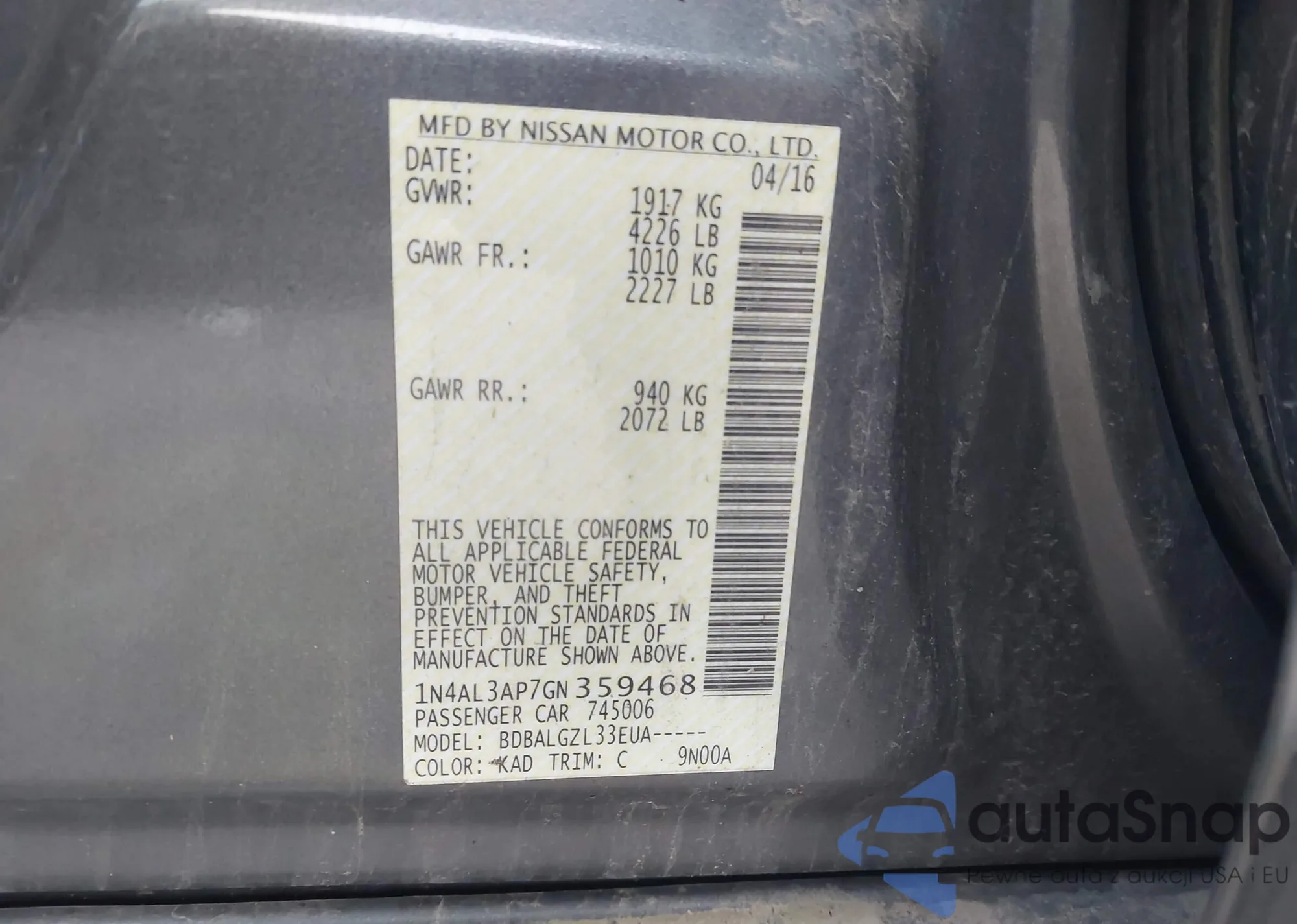 • VIN 1N4AL3AP7GN359468