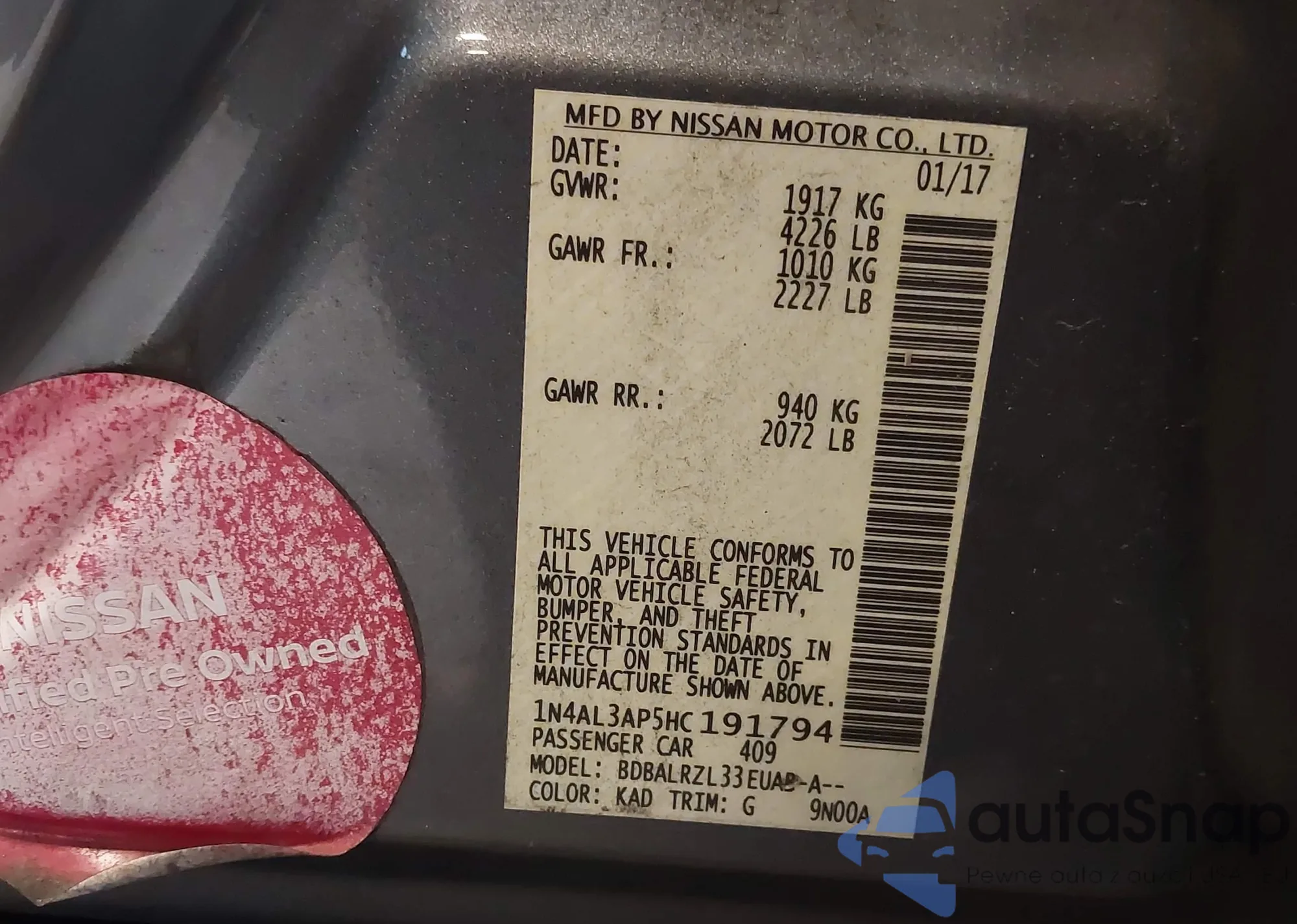 • VIN 1N4AL3AP5HC191794