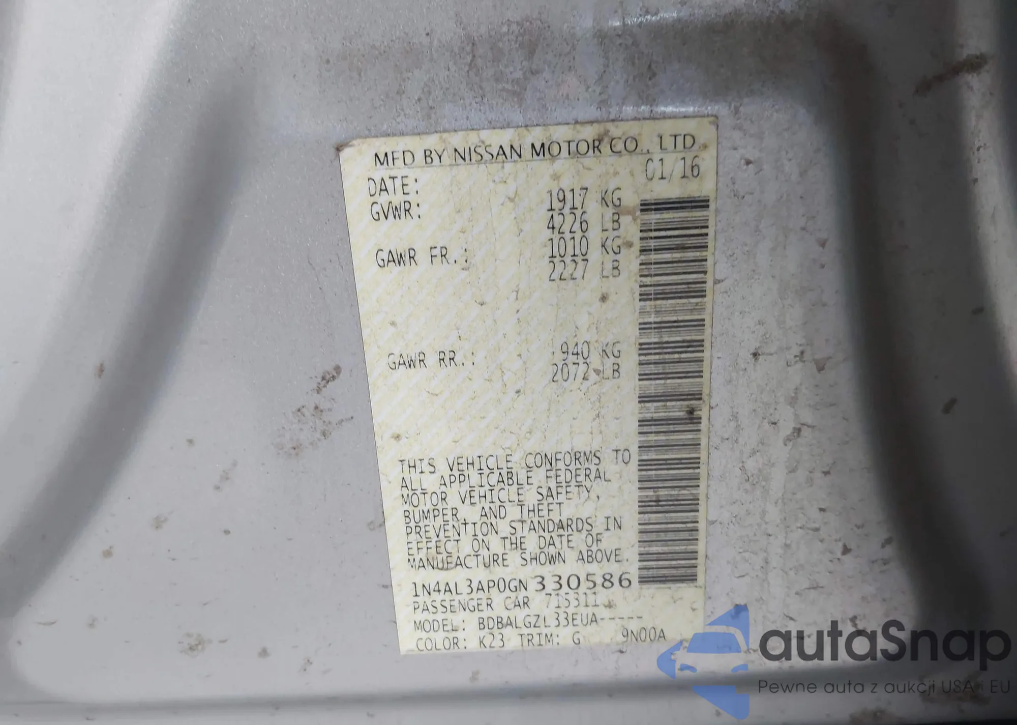 • VIN 1N4AL3AP9GC147831