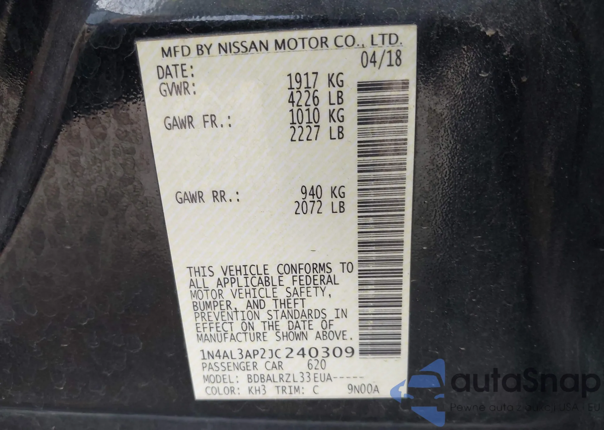• VIN 1N4AL3AP2JC240309