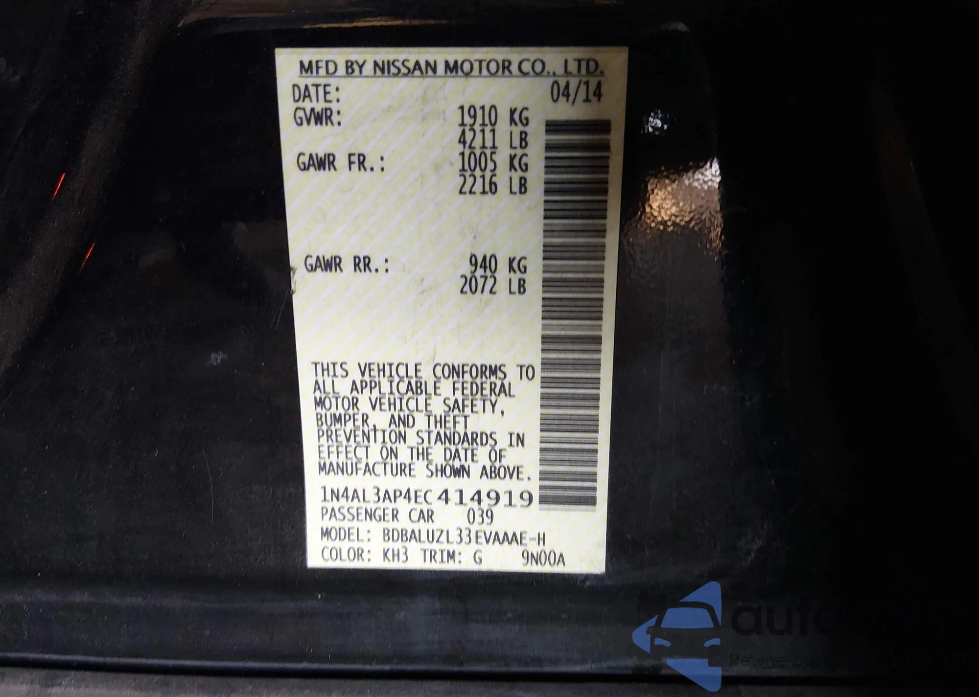 • VIN 1N4AL3AP4EC414919