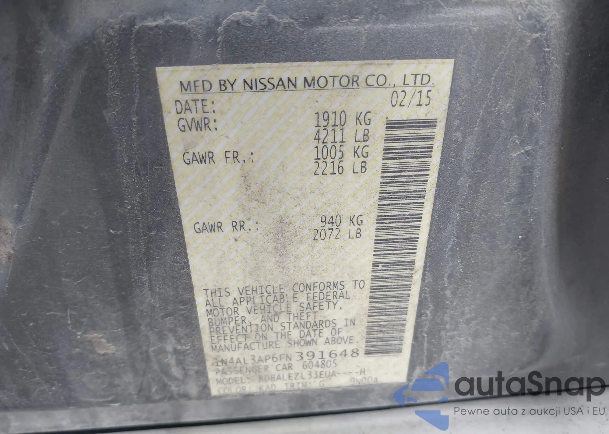 • VIN 1N4AL3AP6FN391648
