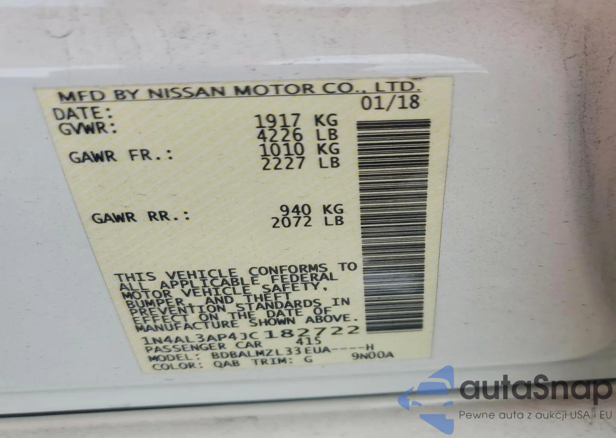 LOT: 72433415 VIN: 1N4AL3AP4JC182722