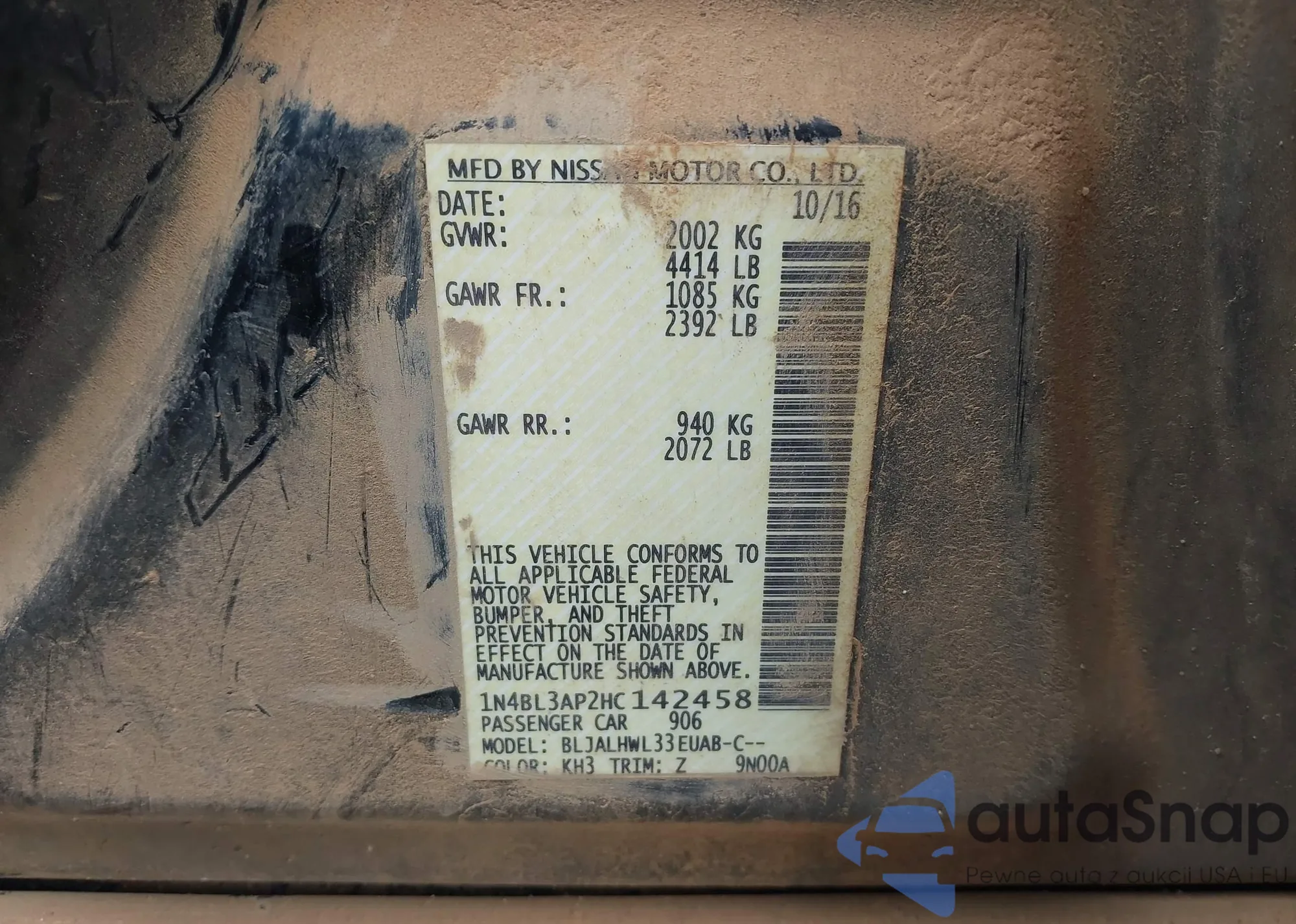 LOT: 44132843 VIN: 1N4BL3AP2HC142458