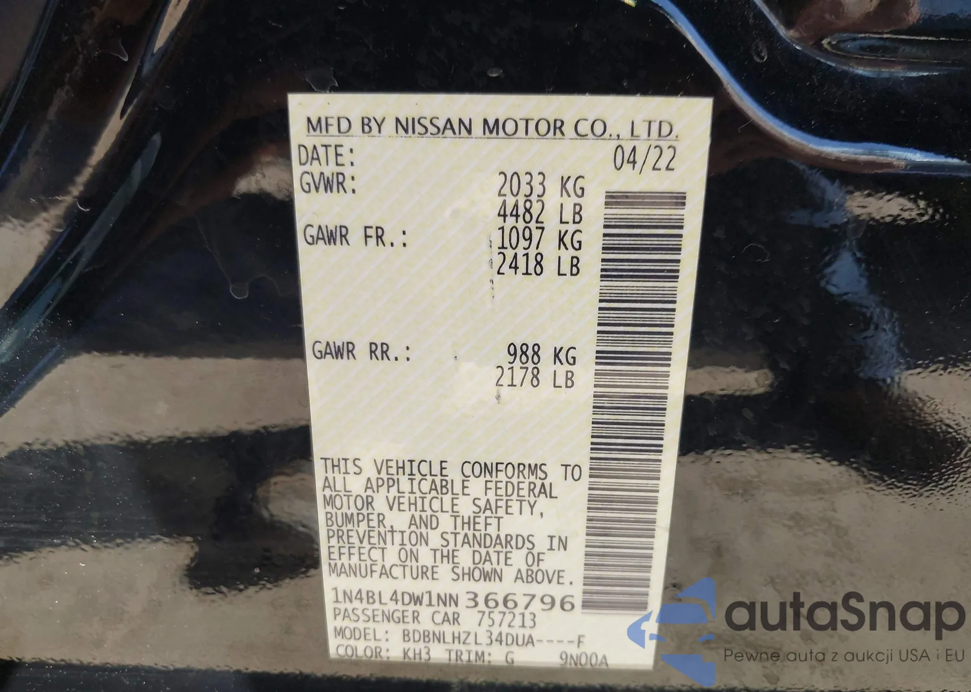 LOT: 43591027 VIN: 1N4BL4DW1NN366796