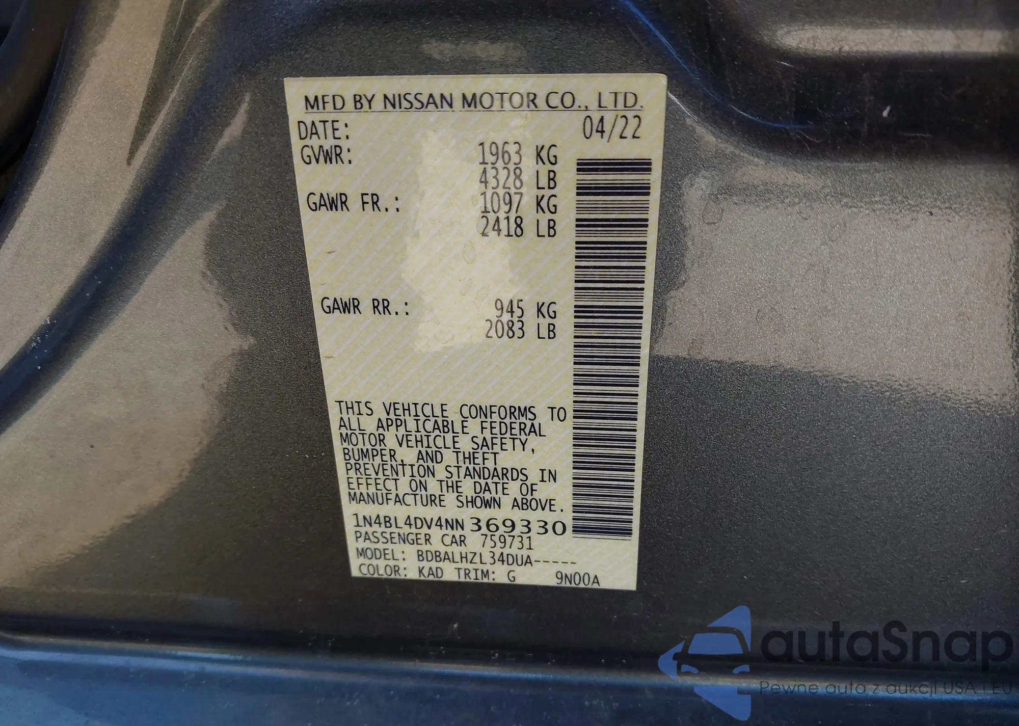 • VIN 1N4BL4DV4NN369330