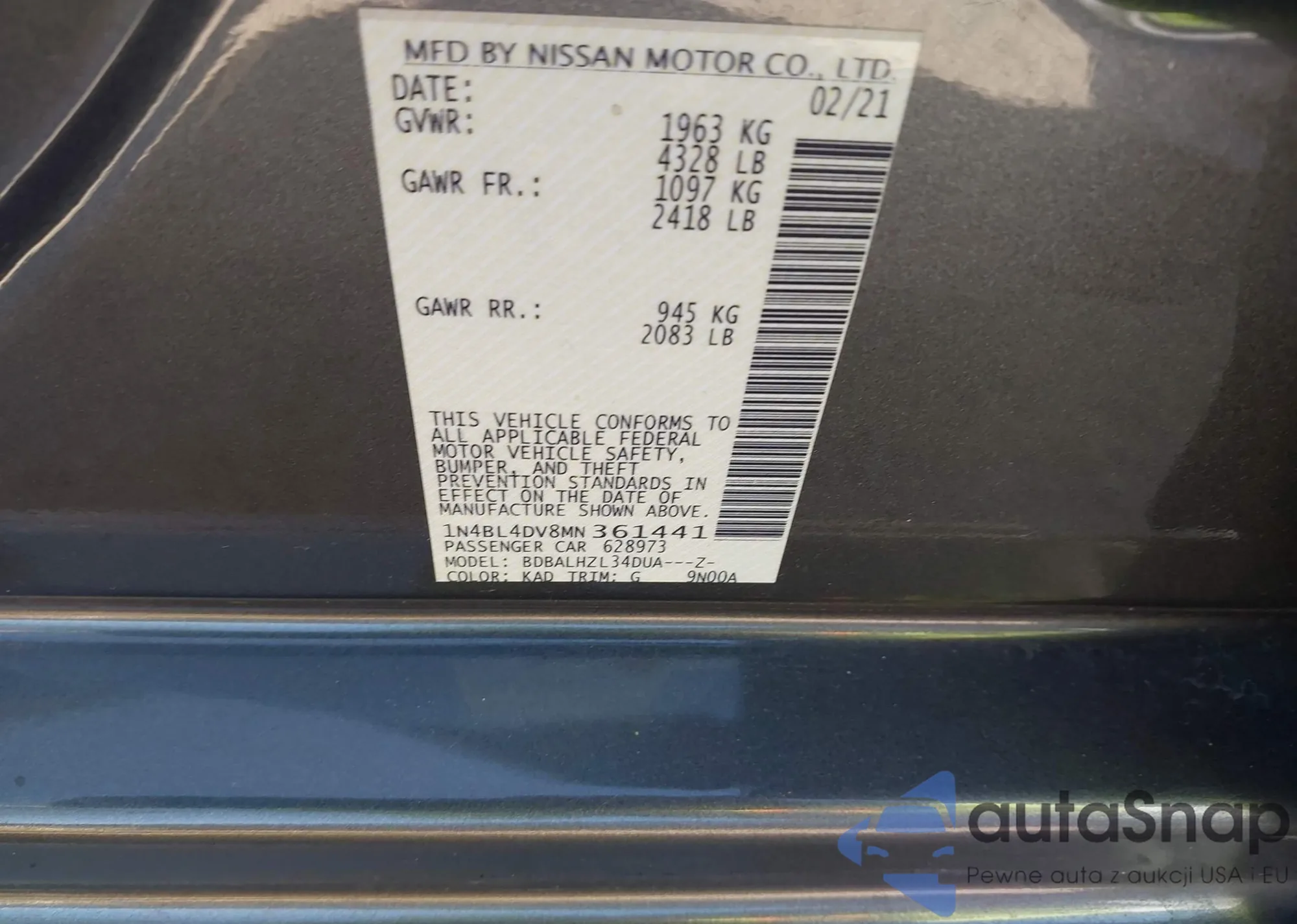LOT: 43673444 VIN: 1N4BL4DV8MN361441
