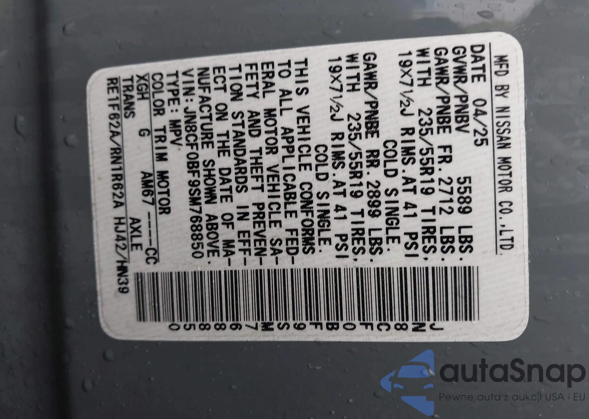 LOT: 44316294 VIN: JN8CF0BF9SM768850