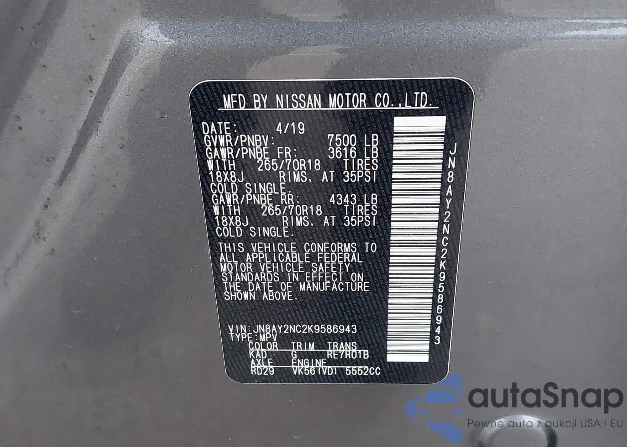 LOT: 43795067 VIN: JN8AY2NC2K9586943