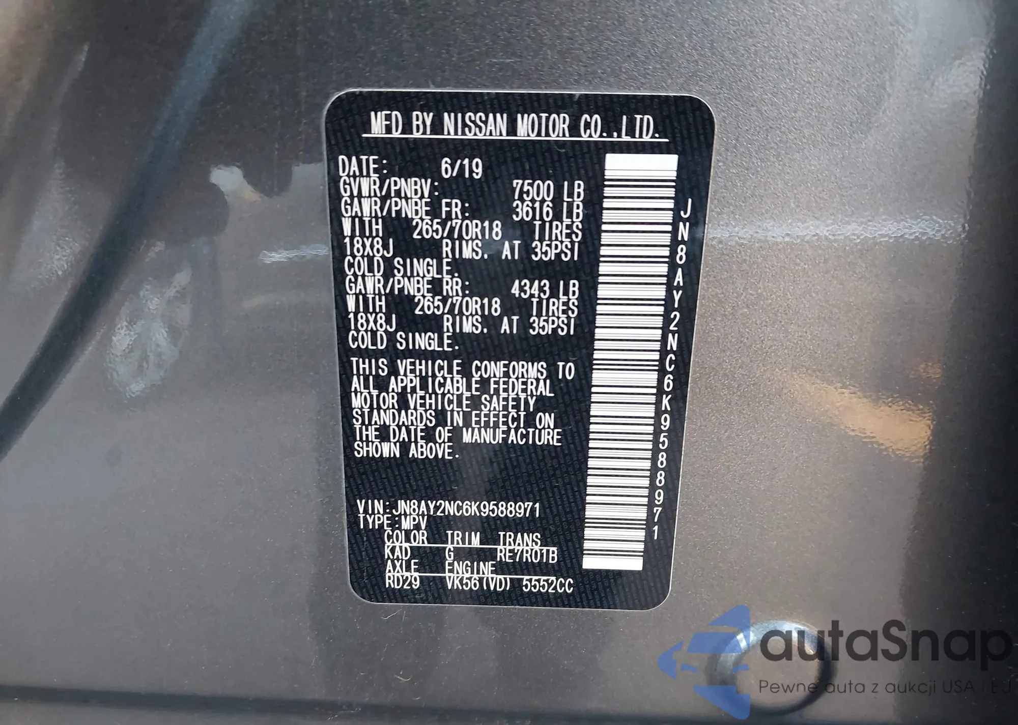 LOT: 43905255 VIN: JN8AY2NC6K9588971