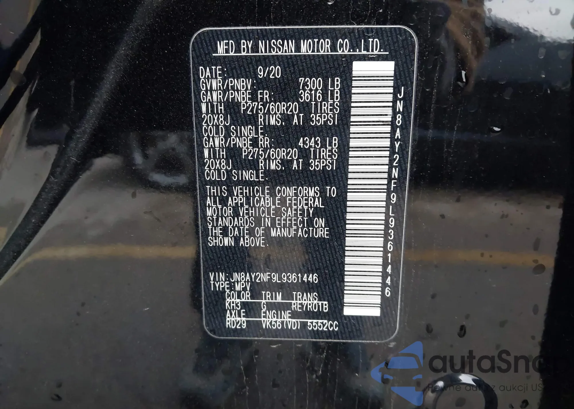 LOT: 43857515 VIN: JN8AY2NF9L9361446