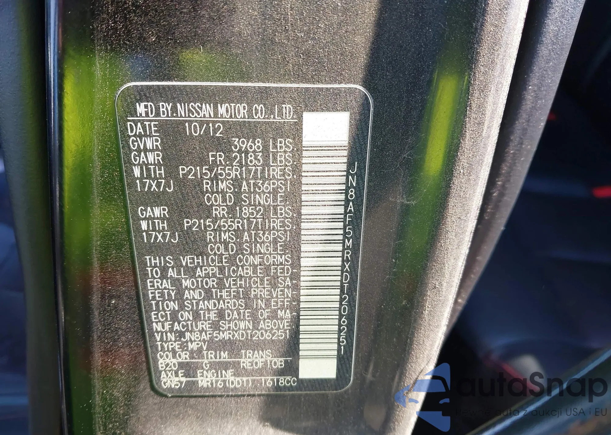LOT: 44356155 VIN: JN8AF5MRXDT206251