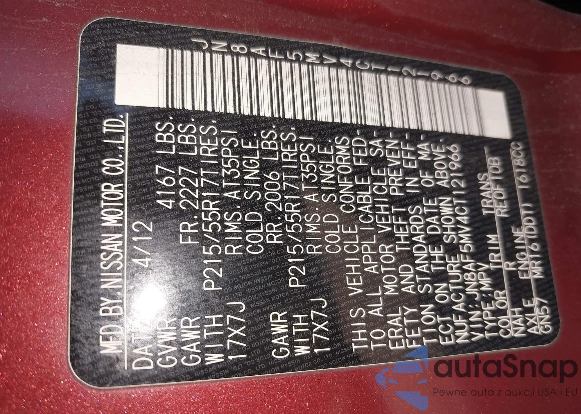 LOT: 90925535 VIN: JN8AF5MR5DT215875