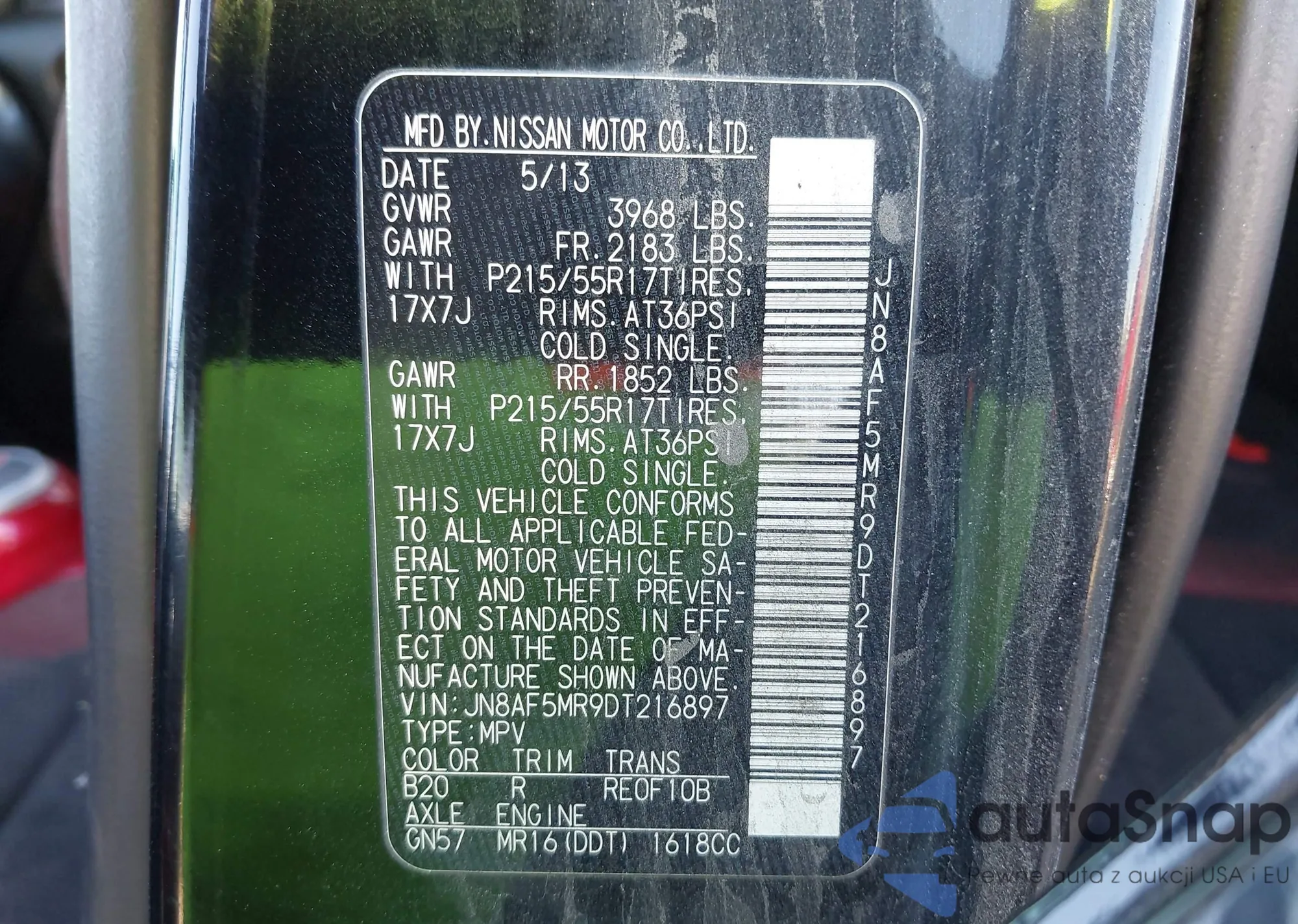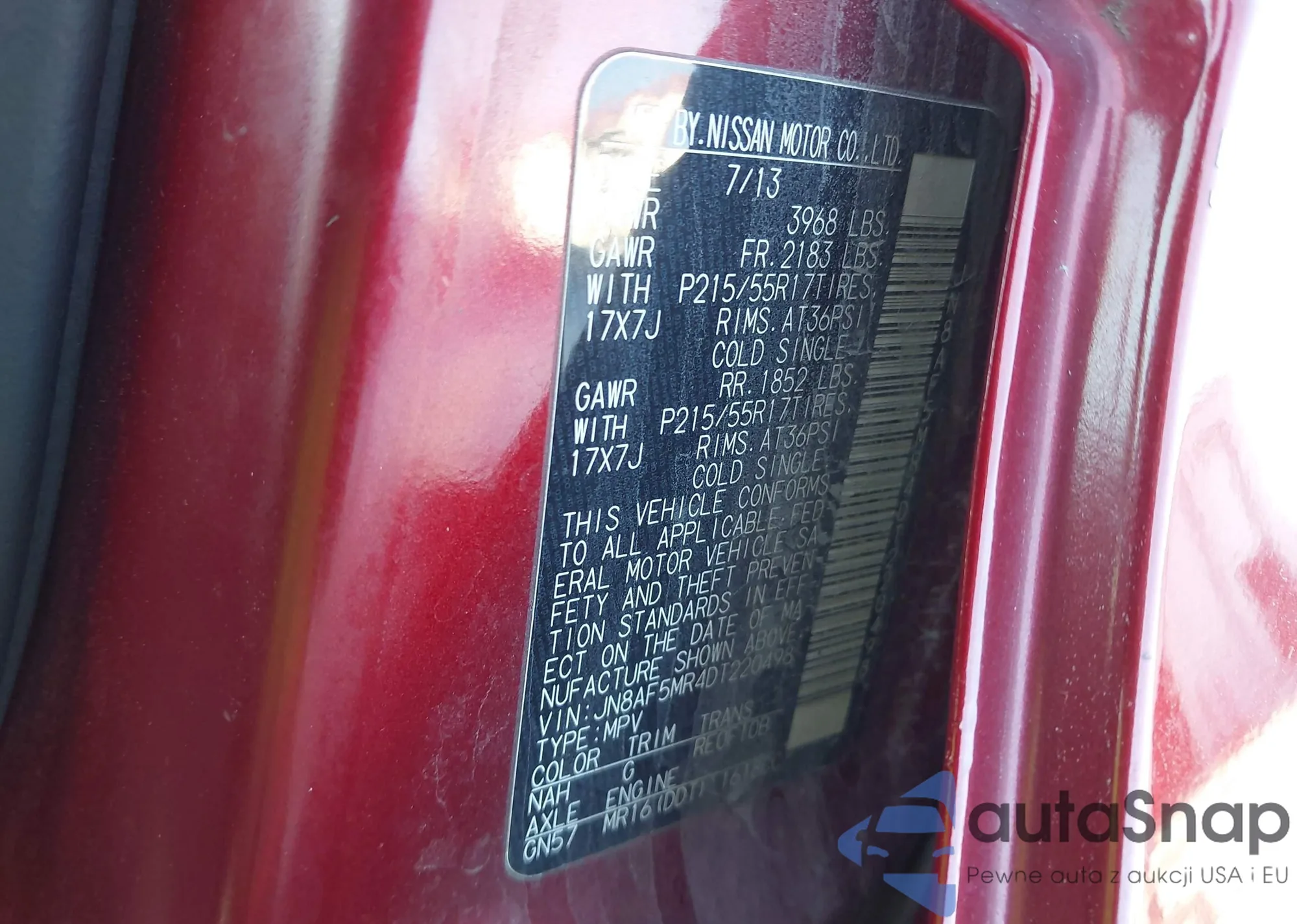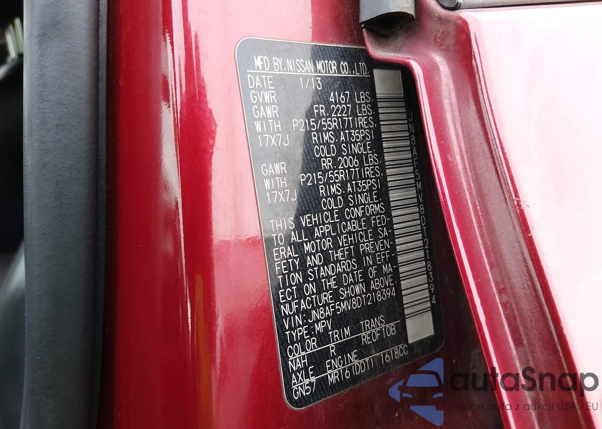 LOT: 43911542 VIN: JN8AF5MR9DT216897