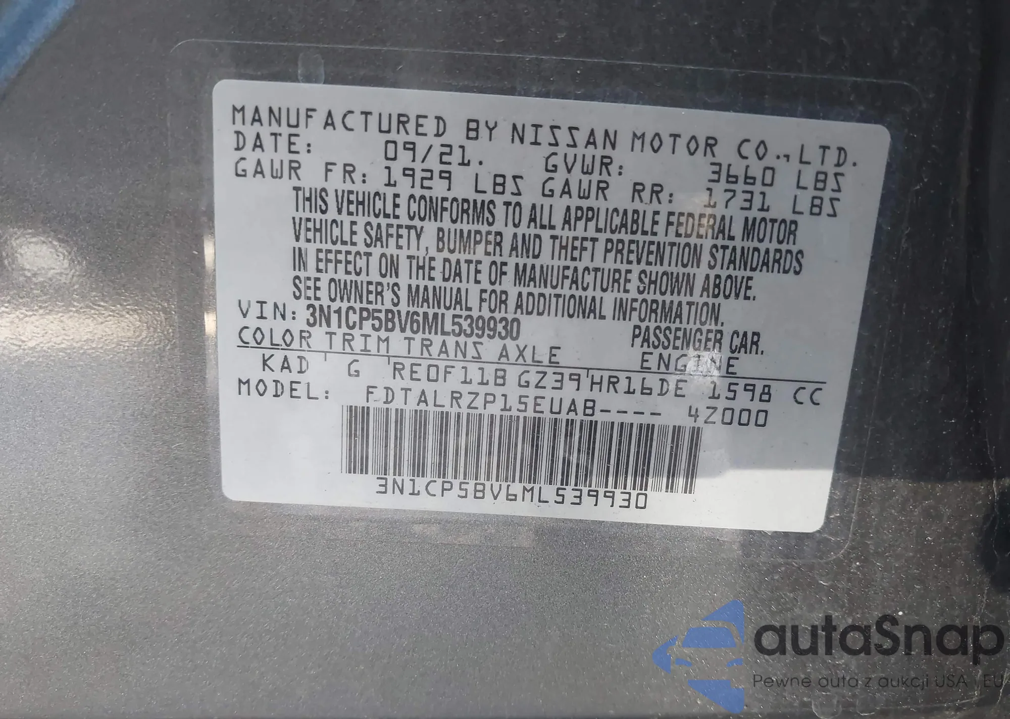 • VIN 3N1CP5BV6ML539930