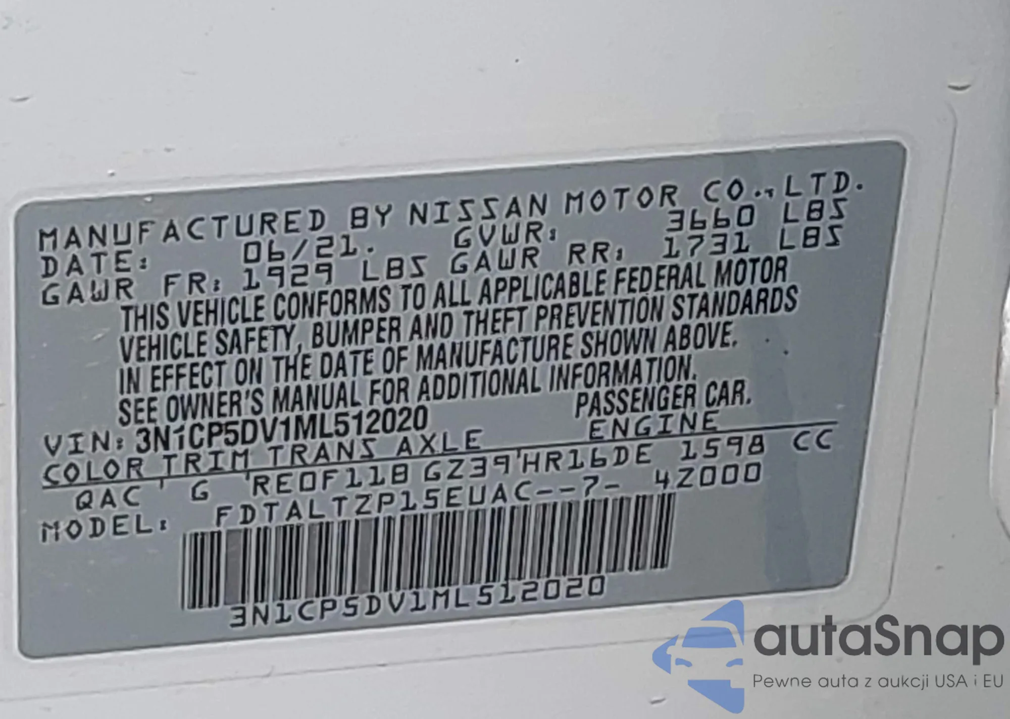 LOT: 42803563 VIN: 3N1CP5DV1ML512020