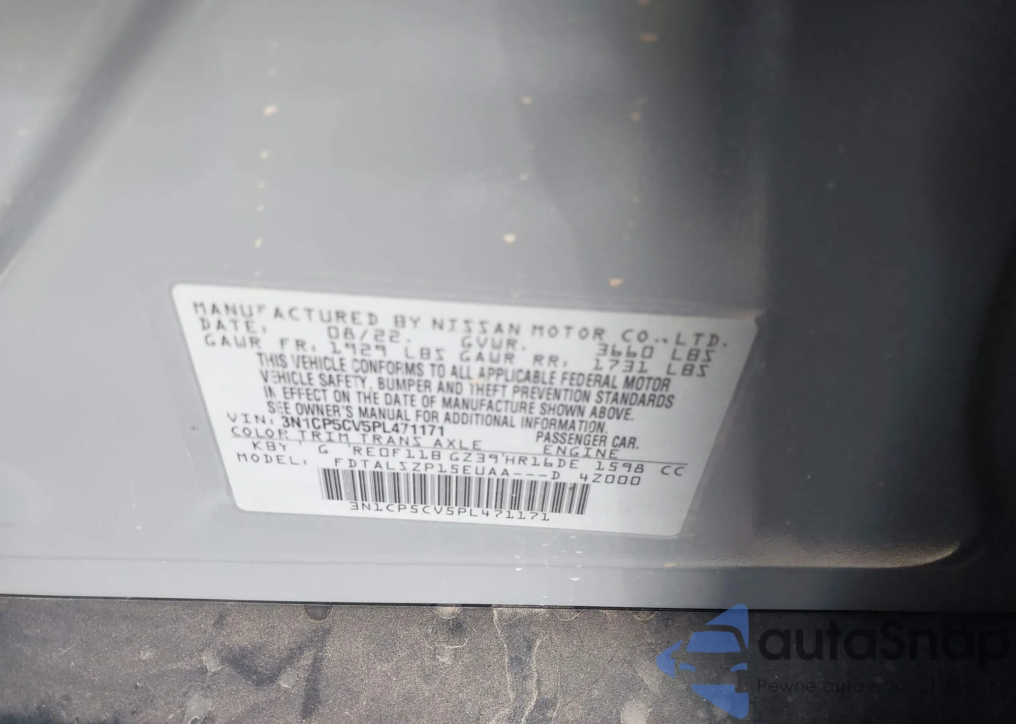 LOT: 43971936 VIN: 3N1CP5BV1PL470102
