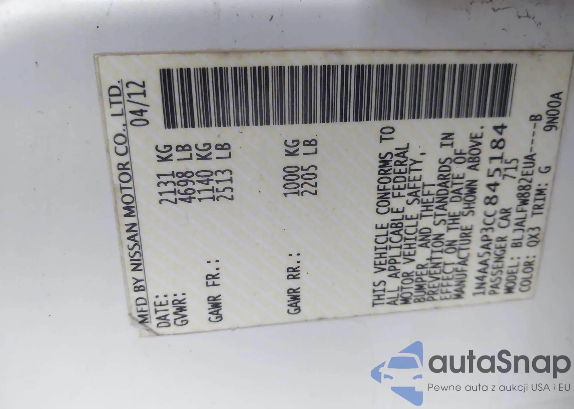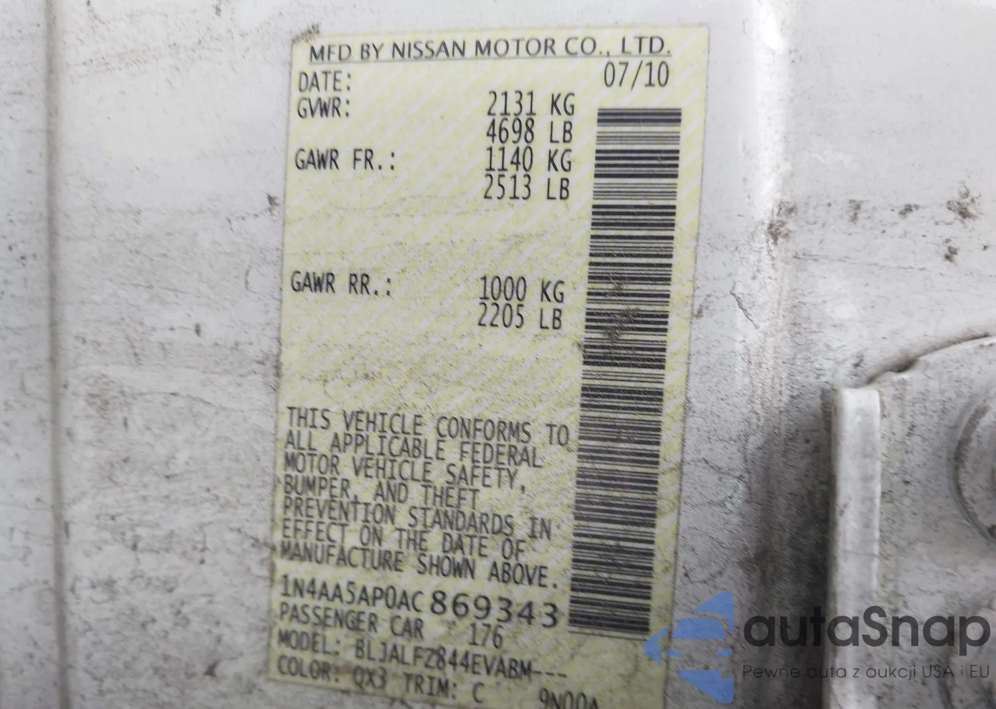 LOT: 93509425 VIN: 1N4AA5AP9EC431474