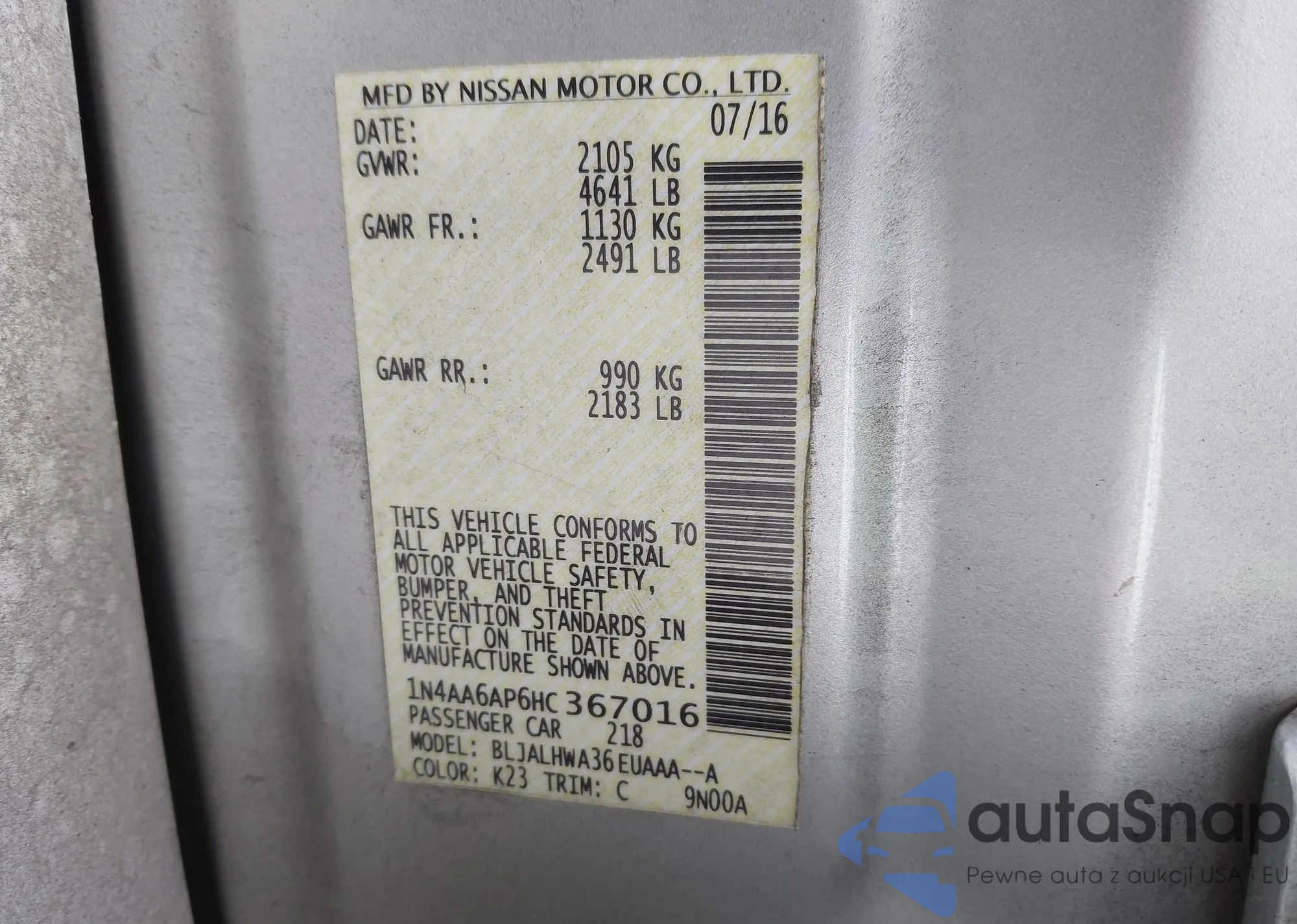 LOT: 44132899 VIN: 1N4AA6AP6HC367016