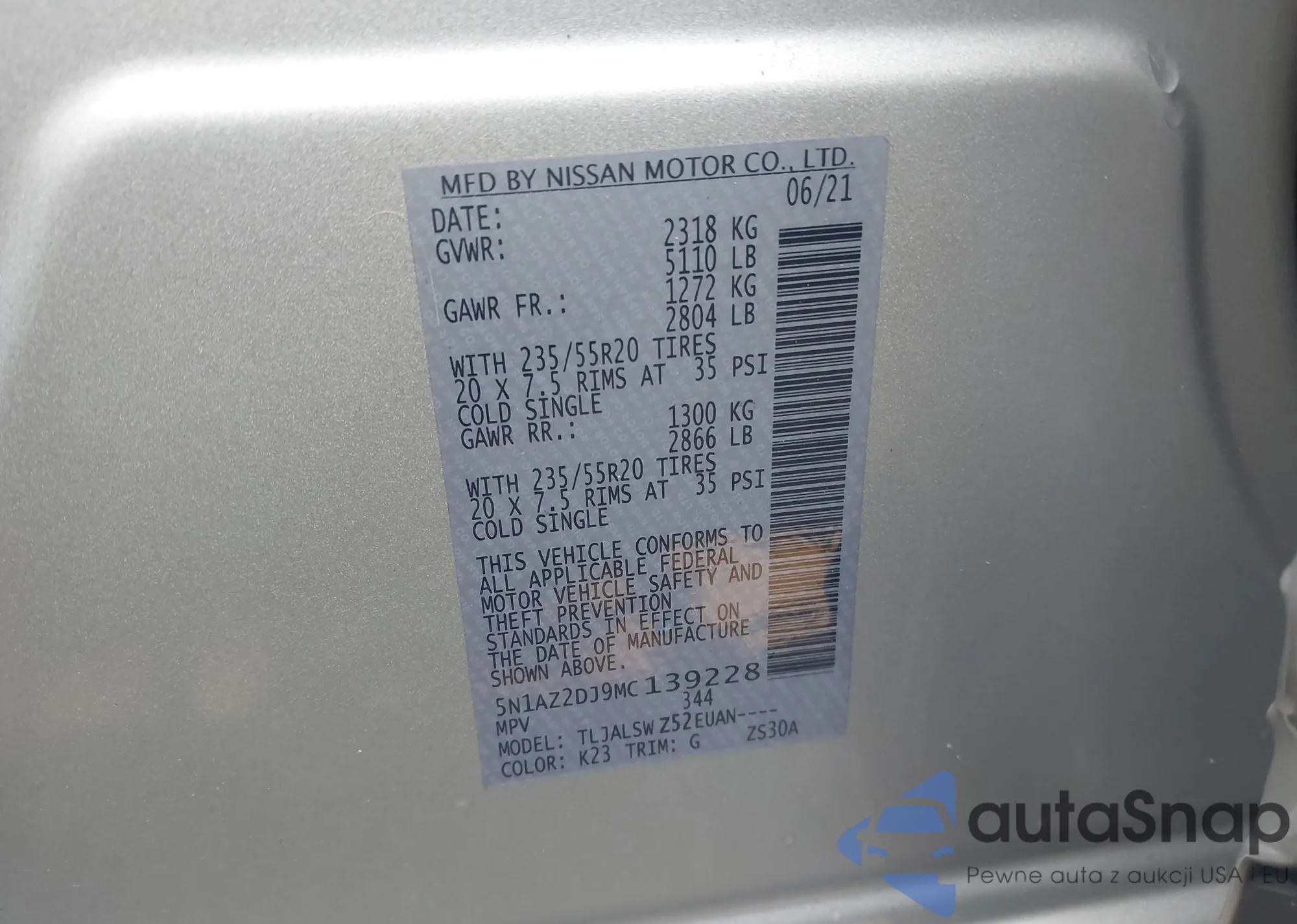 • VIN 5N1AZ2DJ9MC139228