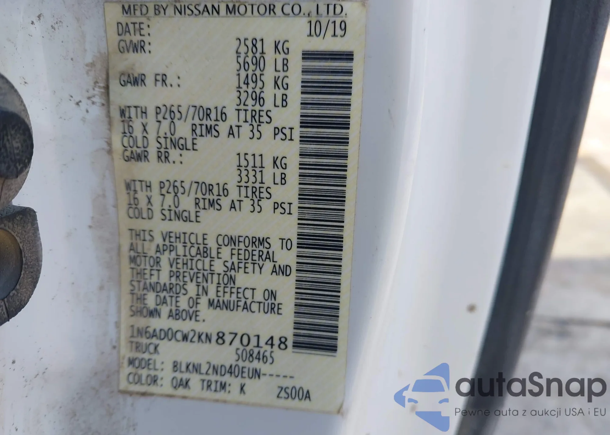 LOT: 43992654 VIN: 1N6AD0CW2KN870148