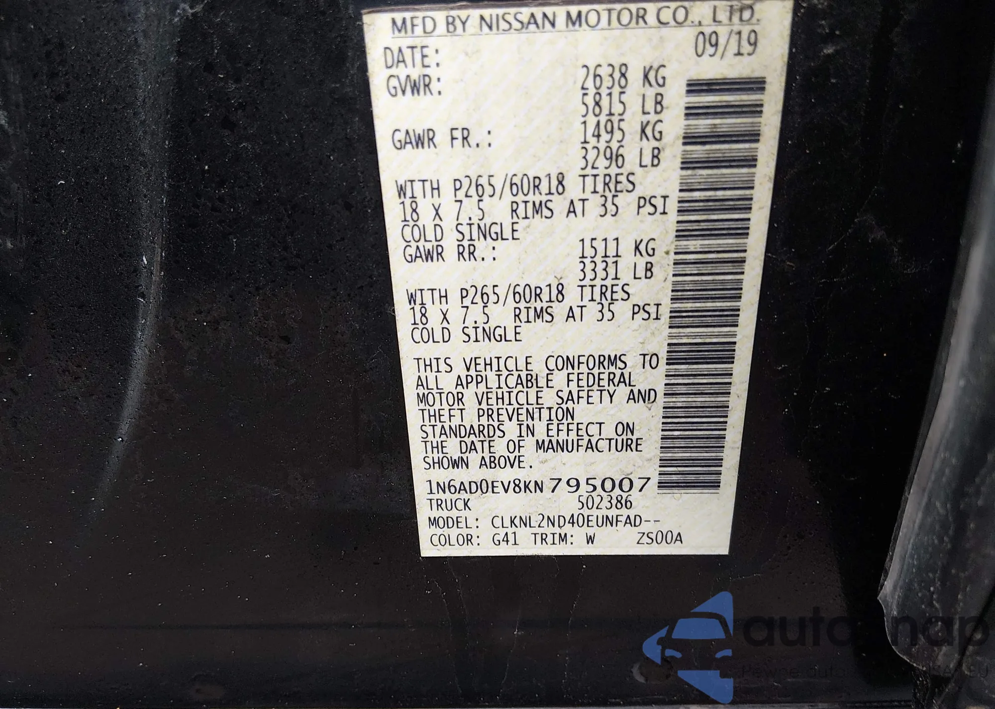 LOT: 44096887 VIN: 1N6AD0EV8KN795007