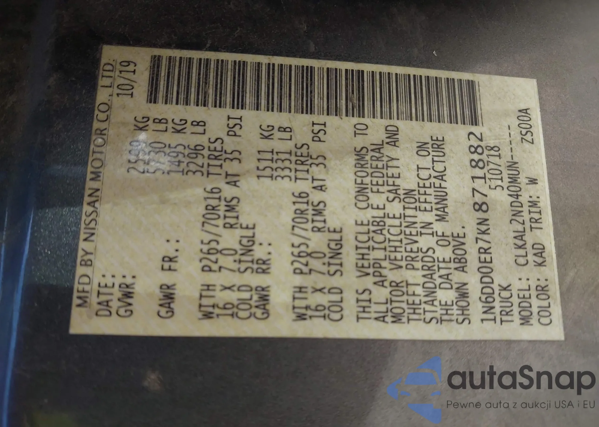 • VIN 1N6DD0ER7KN871882