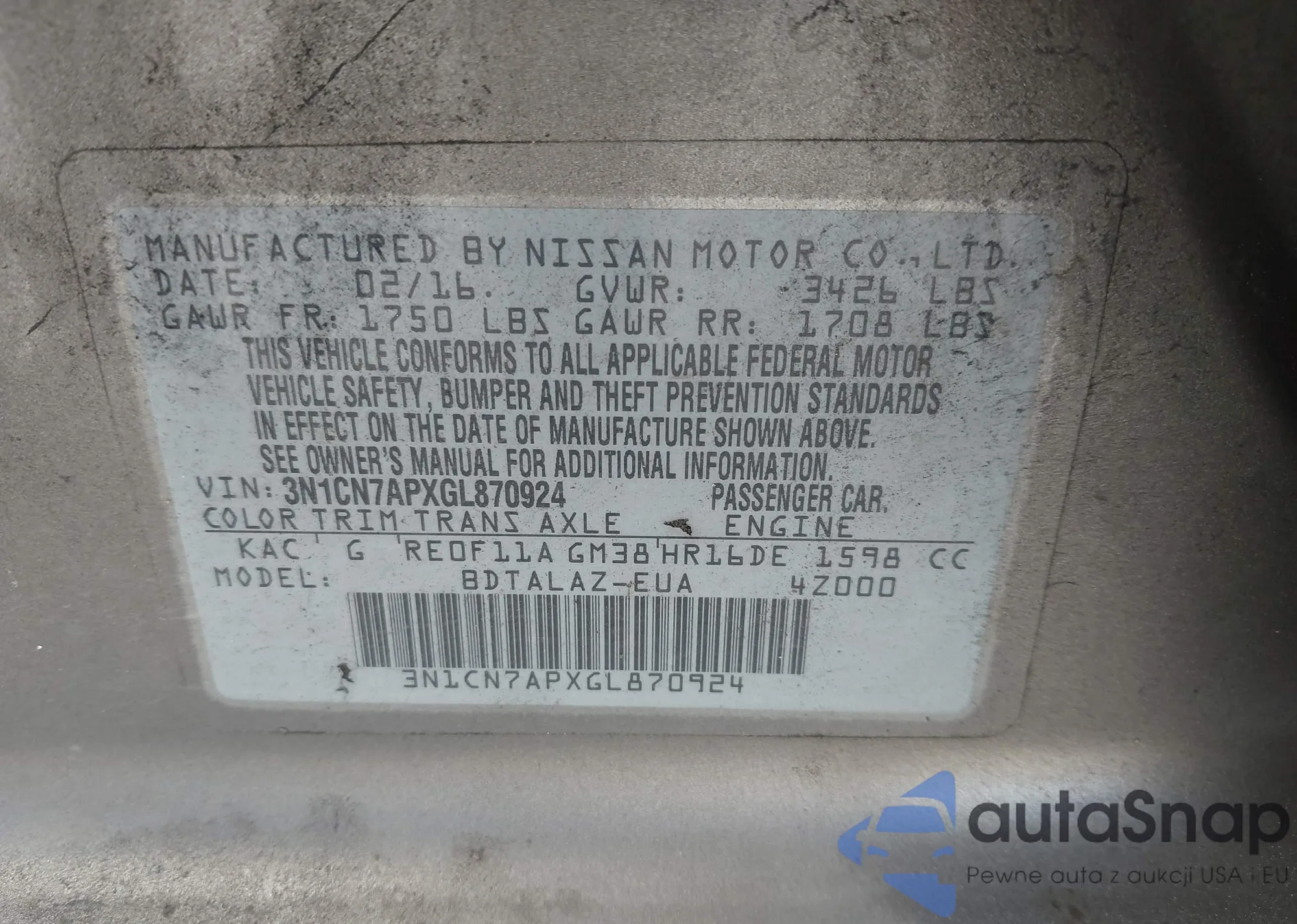 • VIN 3N1CN7APXGL870924
