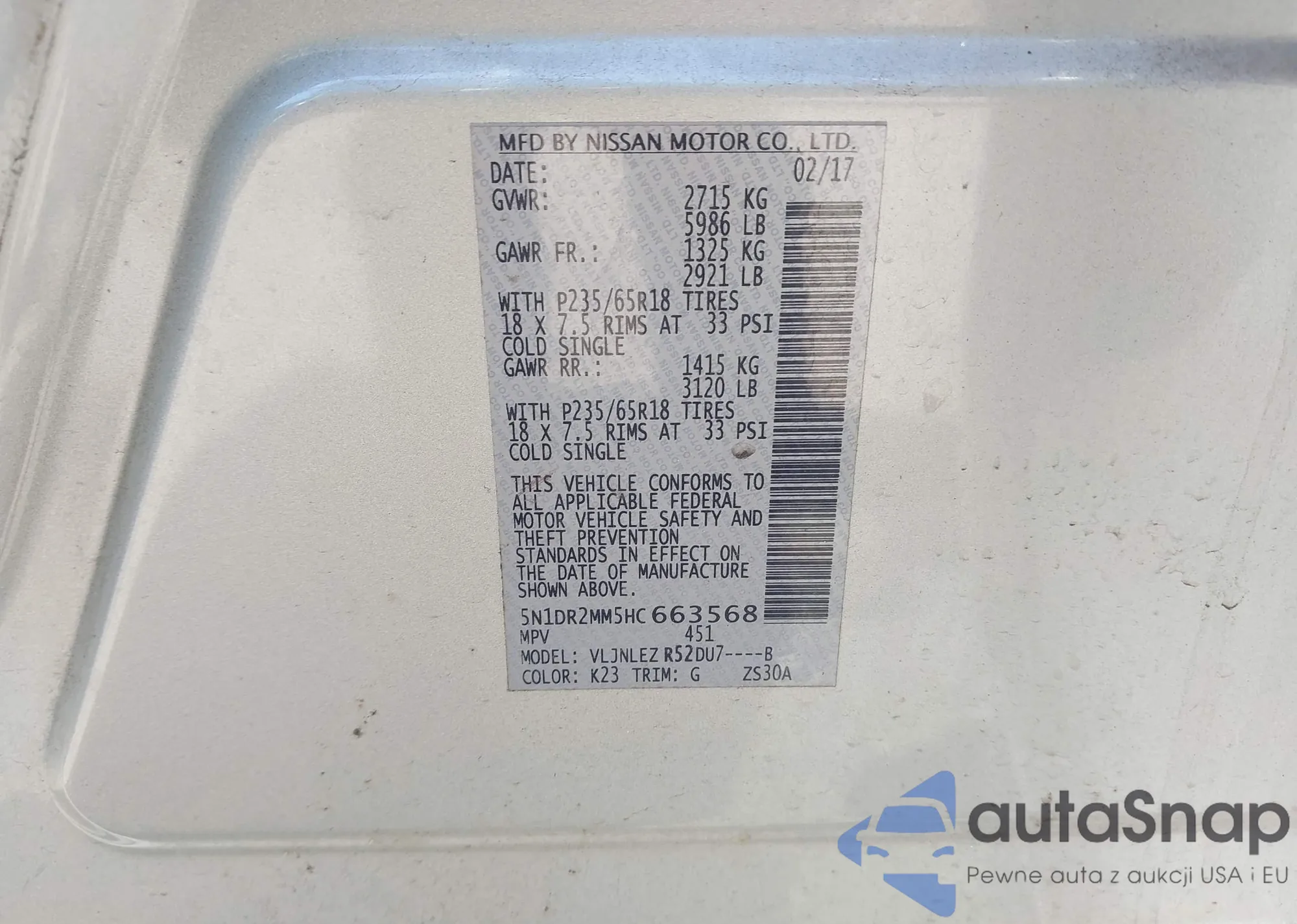 LOT: 43292980 VIN: 5N1DR2MM6HC913285