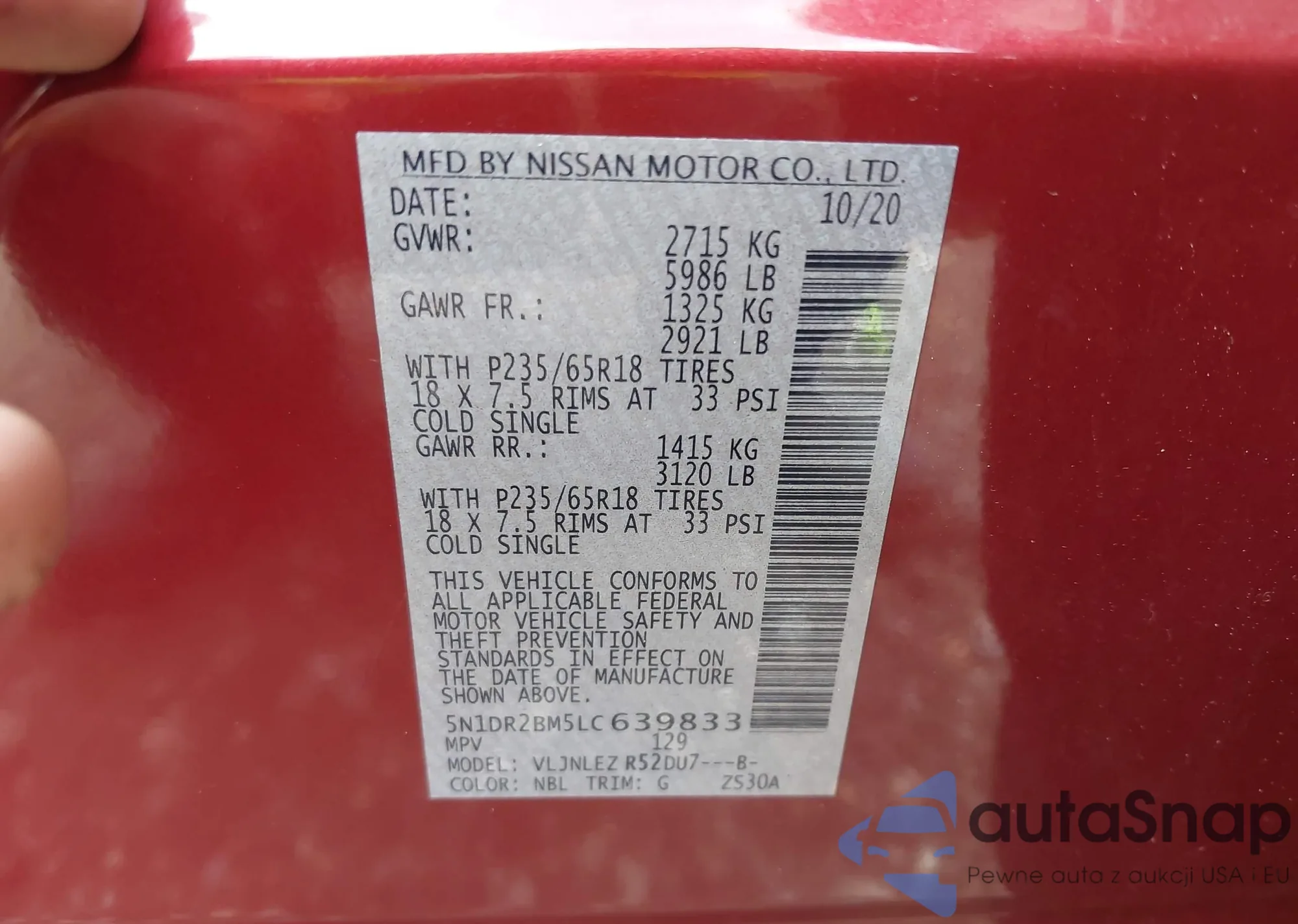 LOT: 43294220 VIN: 5N1DR2BM5LC639833