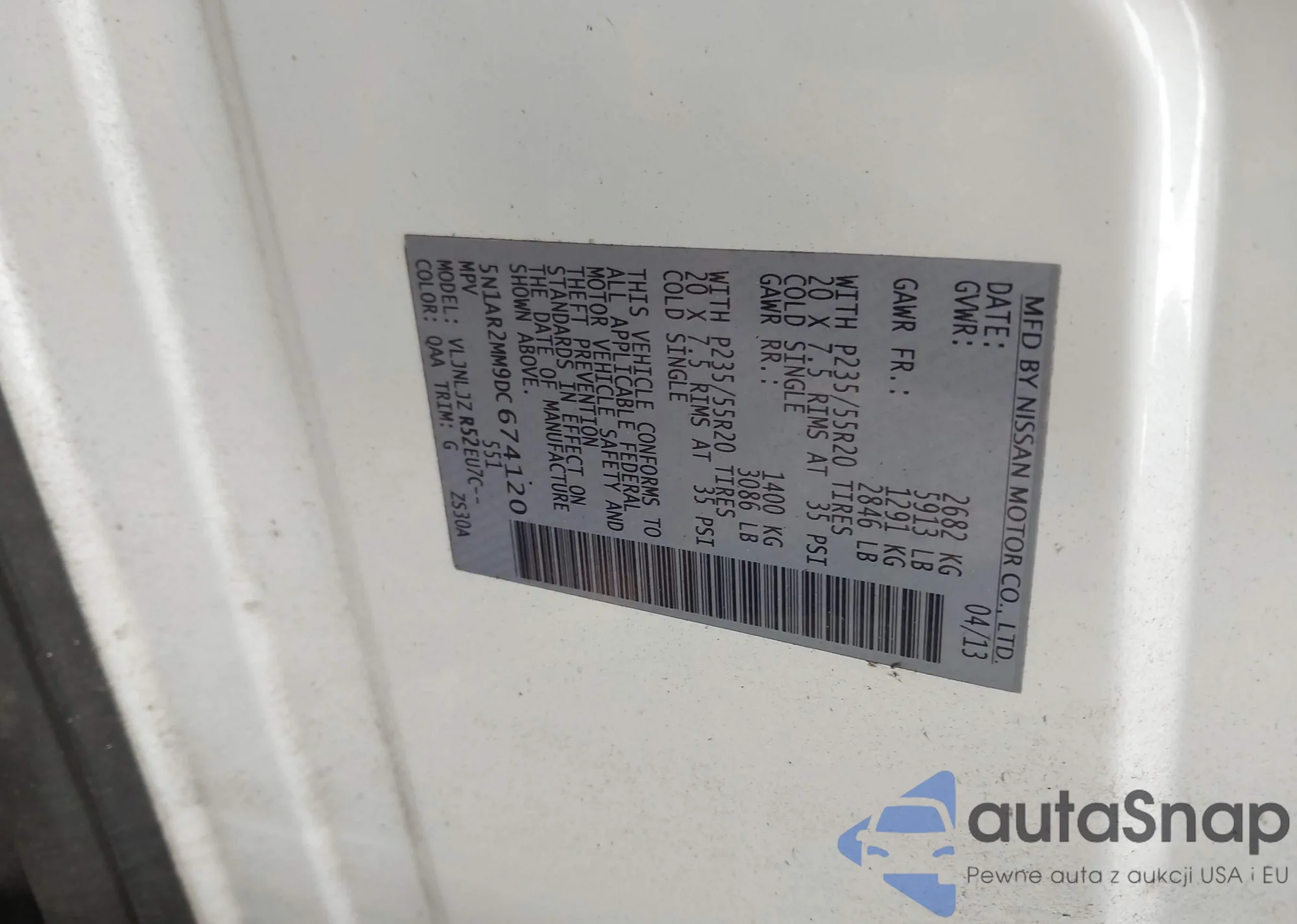 LOT: 42930106 VIN: 5N1AR2MM9DC674120
