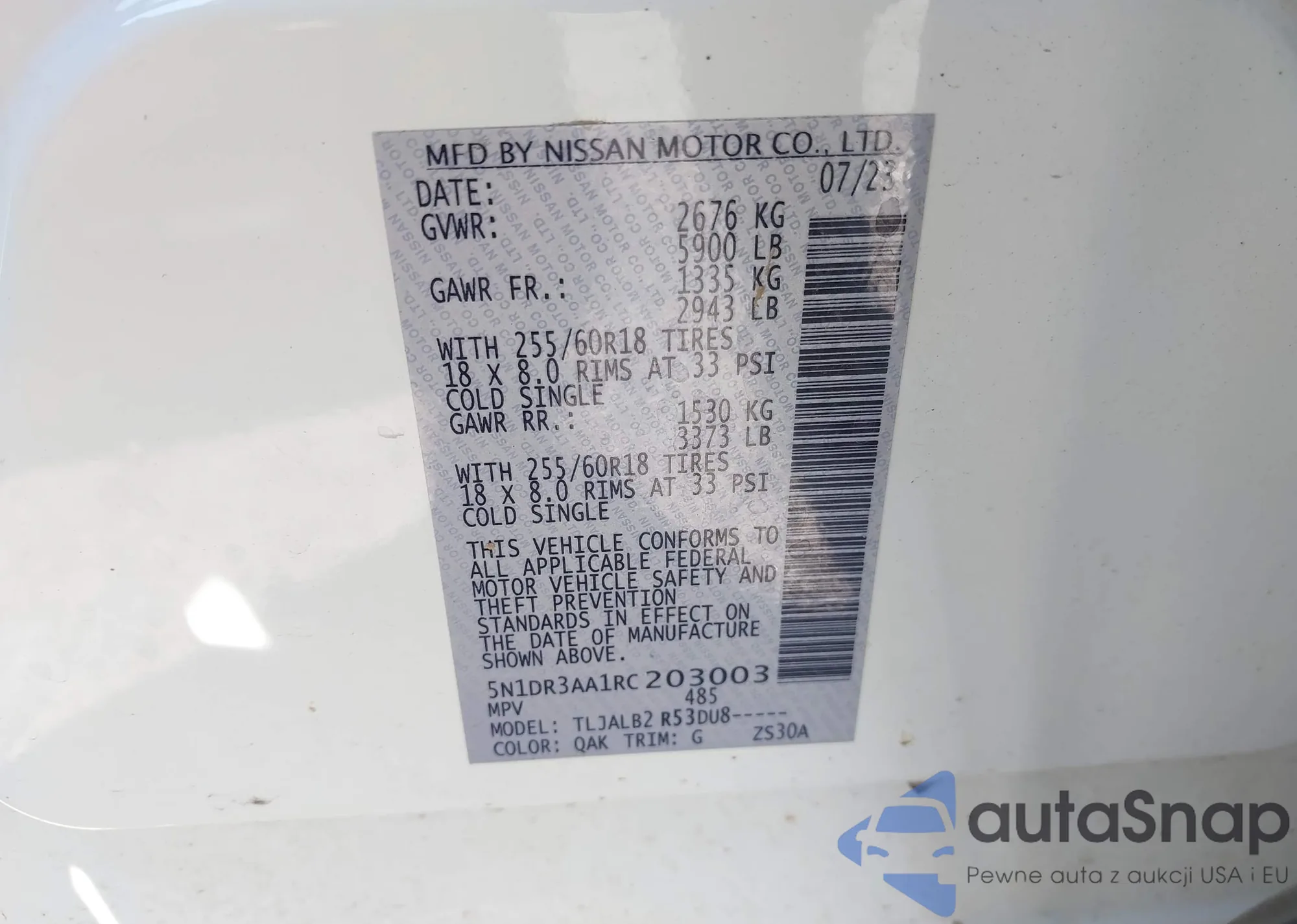 LOT: 42905445 VIN: 5N1AR18W87C623766