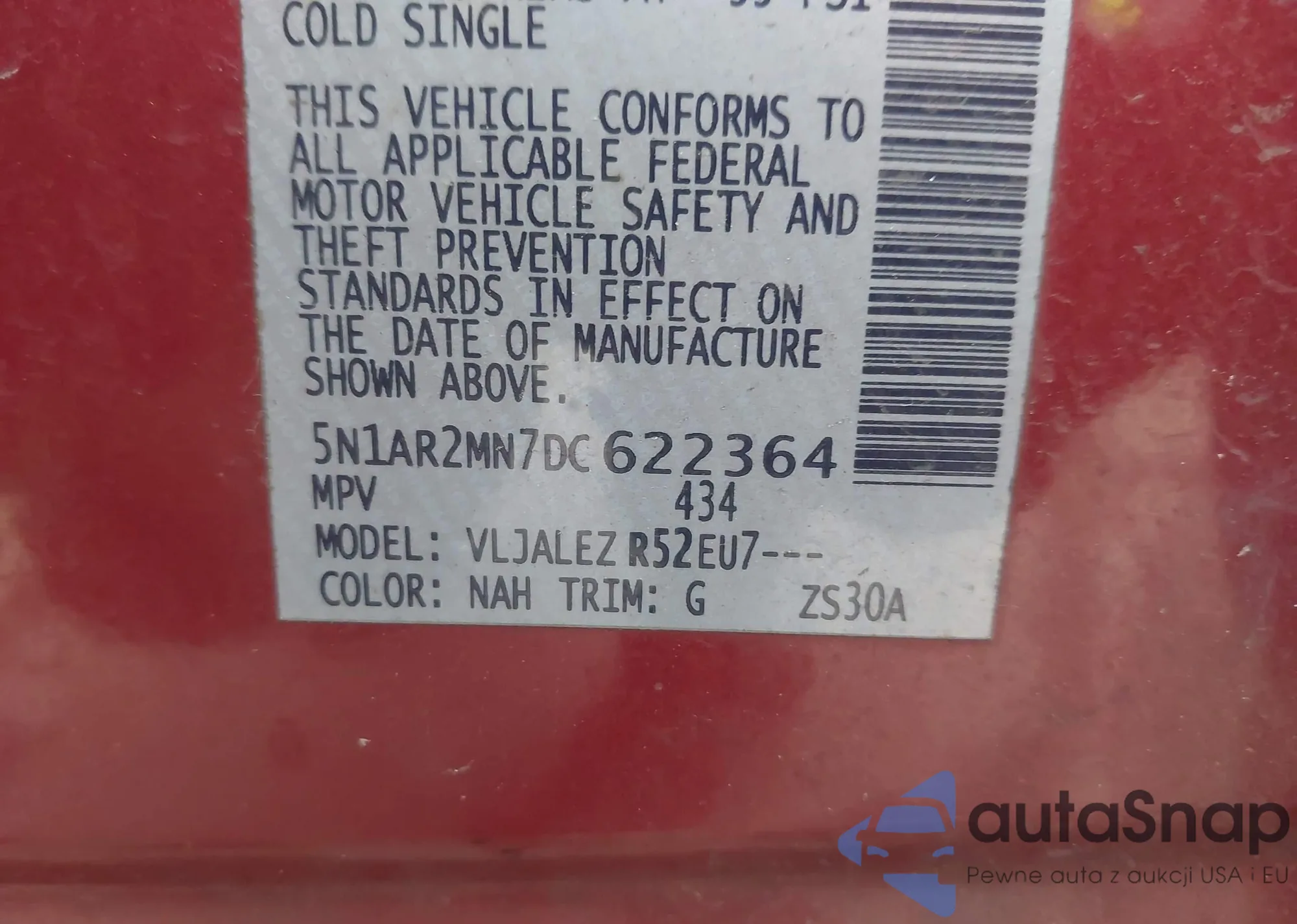 • VIN 5N1AR2MN7DC622364