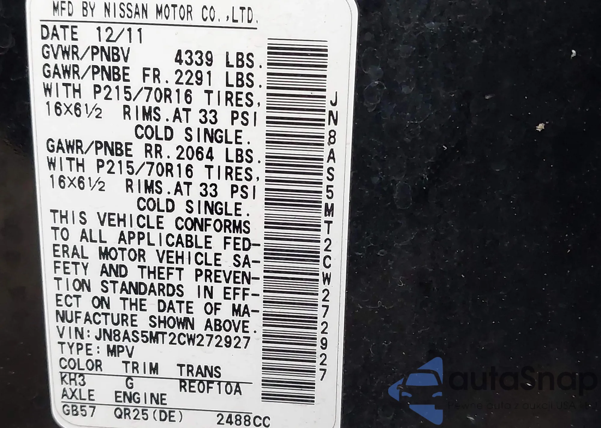 • VIN JN8AS5MT2CW272927